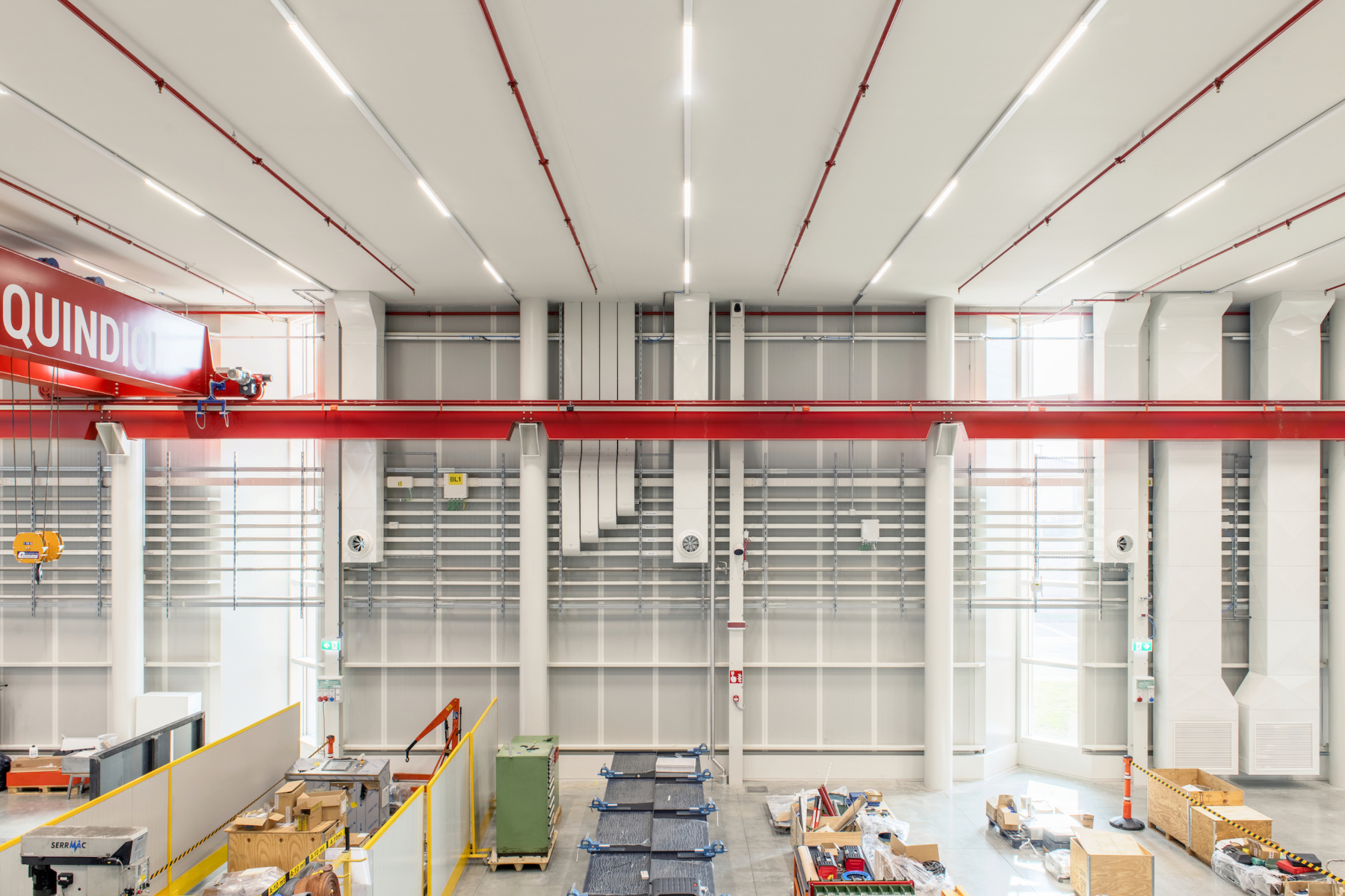 Il progetto ha previsto la possibilità di installare ulteriori UTA, dedicate al laboratorio climatizzato controllo umidità e all’area test dell’officina. Per facilitare le operazioni di installazione sono stati inseriti dei varchi lungo la parete esterna del mezzanino tecnico, delimitati da portoni.