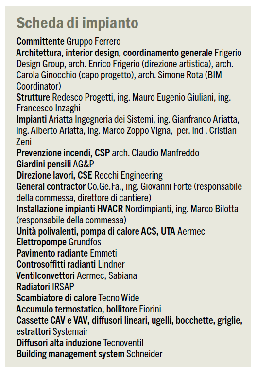 «Il comfort termoigrometrico è assicurato dall’uso di terminali generalmente a bassa temperatura, selezionati in funzione delle tipologie e delle caratteristiche dei diversi ambienti. La produzione dei fluidi è affidata a unità polivalenti che, durante le stagioni di transizione, consentono di incrementare significativamente l’efficienza di generazione. Oltre a queste soluzioni, la pompa di calore booster per l’ACS interviene per aumentare il contenuto termico dell’acqua calda prodotta dalle unità polivalenti, perciò nelle stagioni di transizione e nel funzionamento estivo il sistema è caratterizzato da assorbimenti di energia estremamente contenuti».