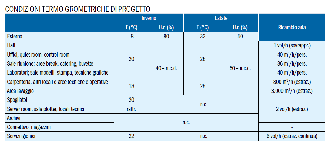 Uffici e sale riunioni al piano terra, laboratori (climatizzato controllo umidità e metrologico) e sale (piegature e stampa, modelli statici e dinamici) sono climatizzati con ventilconvettori a soffitto (a 4 tubi). Tutti questi ambienti dispongono di ventilazione ad aria primaria, con immissione e ripresa tramite diffusori lineari orientabili, posti lungo il perimetro dei locali ed equipaggiati con silenziatori per contenere il “cross talking”.