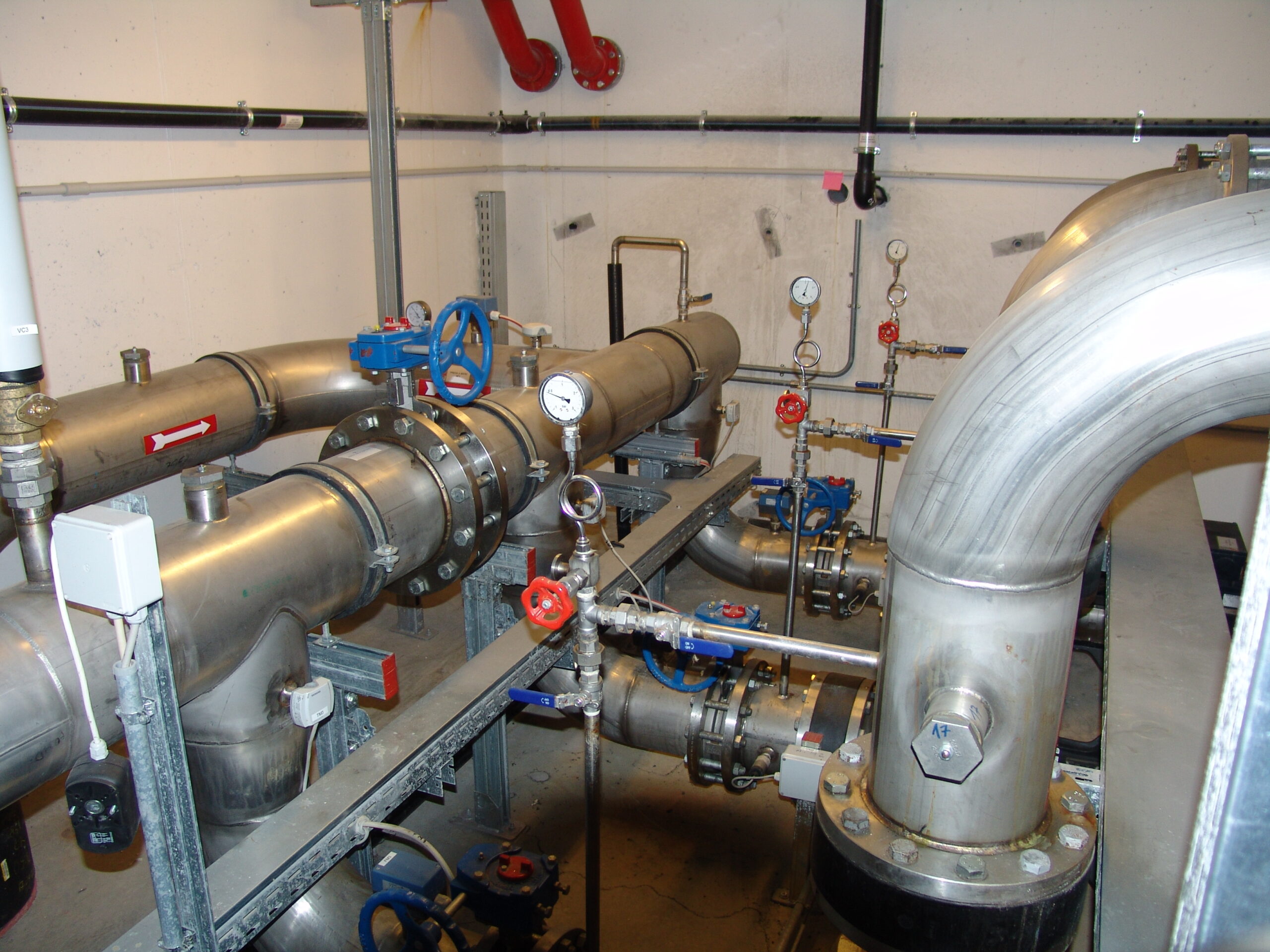 Vista interna della centrale a mare, nella quale avviene lo scambio termico fra l'acqua di mare e il fluido termovettore (acqua glicolata) che percorre l'anello tecnico, permettendo il funzionamento delle pompe di calore (Fabbro Vanni).