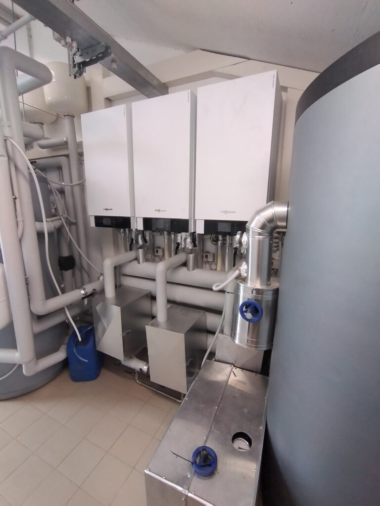 L’alimentazione idrica è attestata su disconnettore idraulico, filtro dissabbiatore autopulente e addolcitore automatico a scambio ionico. Gli erogatori situati nelle cantine e nei garage di ciascuna unità immobiliare e nelle zone condominiali, compreso l’impianto di irrigazione, utilizzano acqua non addolcita.