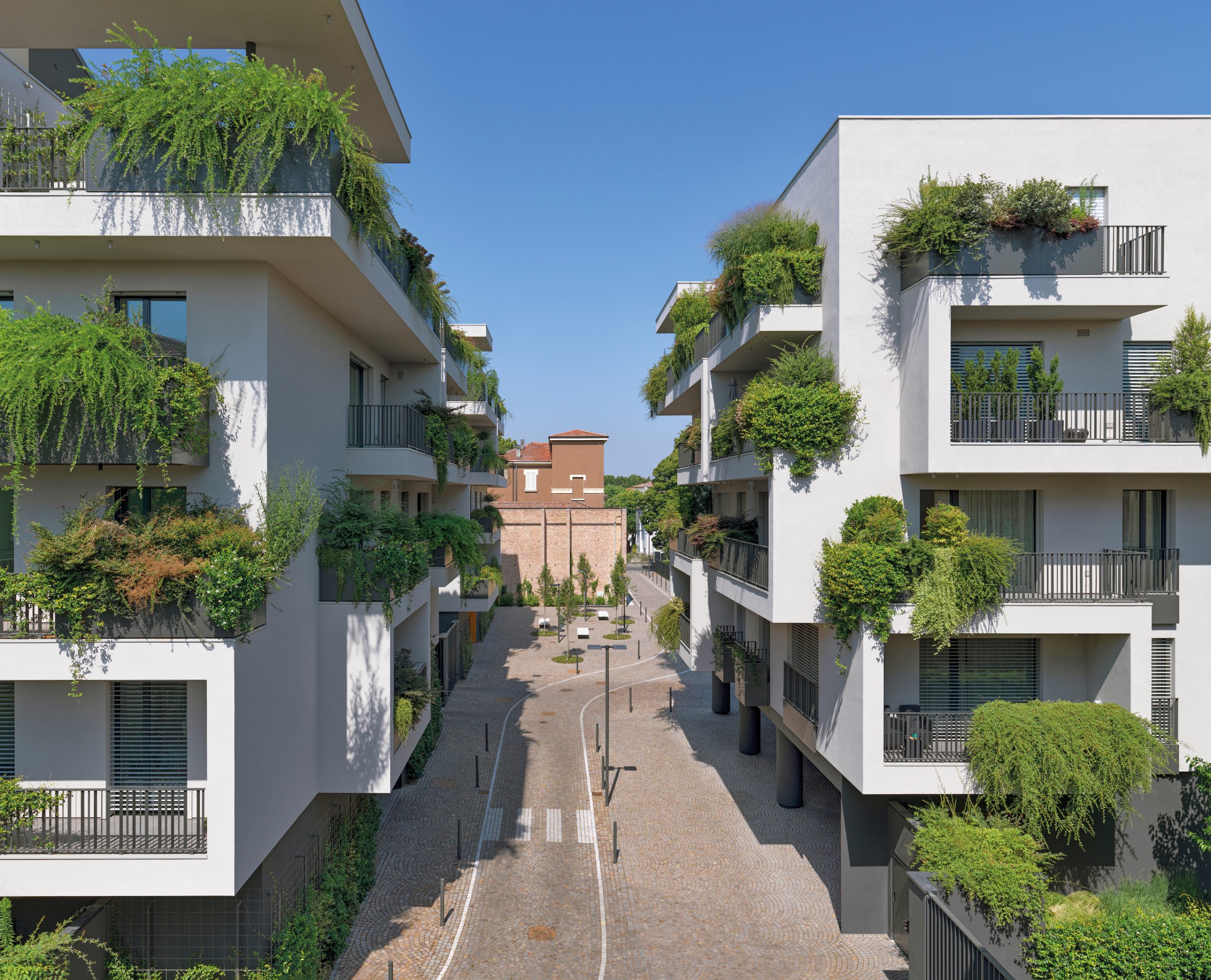 I candidi prospetti sono marcati da balconi, terrazze, aggetti e frangisole, disposti secondo libere geometrie ortogonali, che conferiscono omogeneità all’immagine d’insieme senza pregiudizio per l’unicità delle singole abitazioni. Il verde pensile predomina ovunque, a corredo degli spazi di mediazione fra esterno e interno, ed è parte integrante e qualificante del progetto.