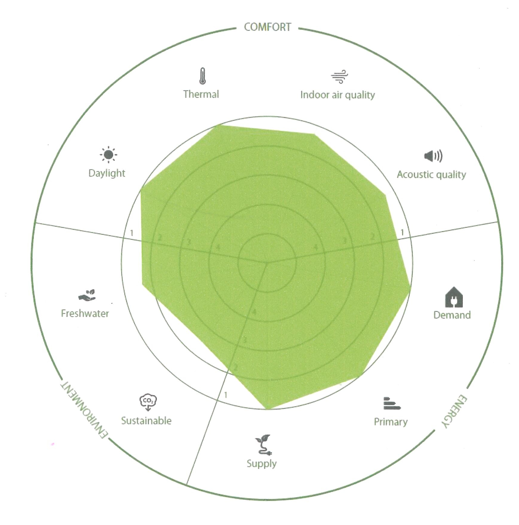 - illuminazione naturale, comfort termico, qualità dell’aria interna, acustica. L’elemento di comunicazione più importante di questo protocollo è il “radar”, che raffigura in maniera intuitiva i risultati ottenuti. Per ottenere la certificazione i punteggi attribuiti (da 1 a 4) devono restituire valori medi minimi di 2,5 (nuove costruzioni) e 3,5 (ristrutturazioni).
