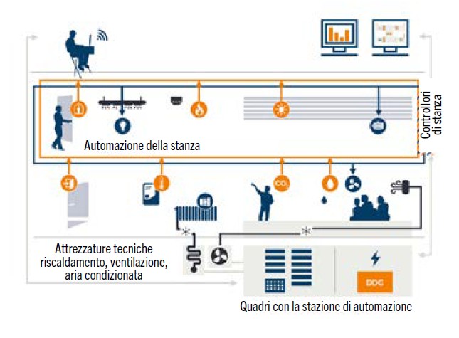 In questo caso l’edificio è gestito come uno smart building, con tutti i sistemi sullo stesso network, affidando all’intelligenza di­stribuita in campo il monitoraggio e l’ottimizzazione del funzio­namento, con possibilità di controllo in loco e in remoto.