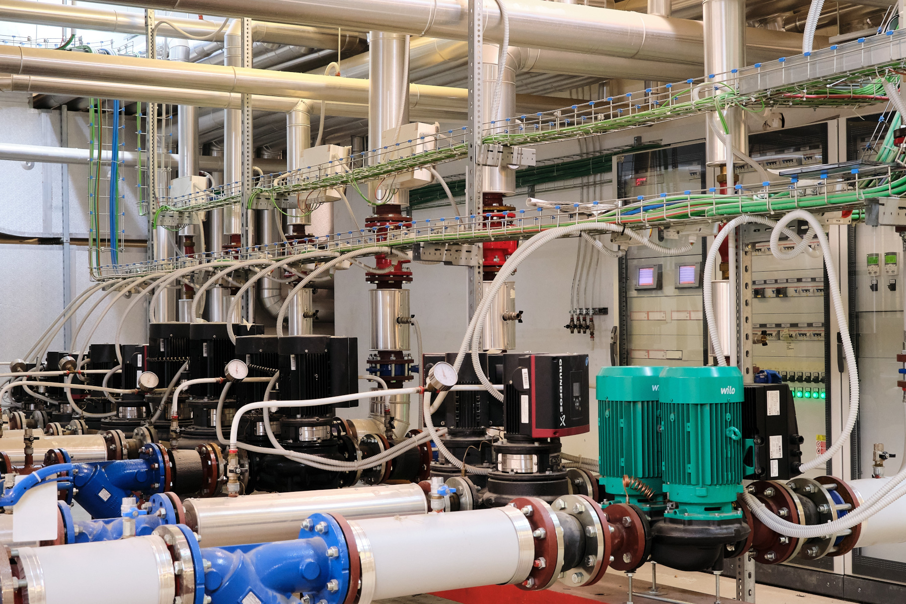 In ambito HVAC il BEMS opera attraverso sottocentrali DDC distribuite, dotate di moduli I/O e metering I/O, per il controllo completo degli impianti di climatizzazione, ventilazione e idrico-sanitari, fra cui le sotto­centrali al servizio dei diversi edifici e le reti di distribuzione. La produzione centralizzata dei fluidi, ad esempio, è demandata al sistema dei generatori termofrigoriferi, che è stato perfettamen­te integrato nell’architettura del BEMS a vantaggio dell’efficien­te distribuzione e regolazione delle condizioni operative nei vari spazi dell’edificio.