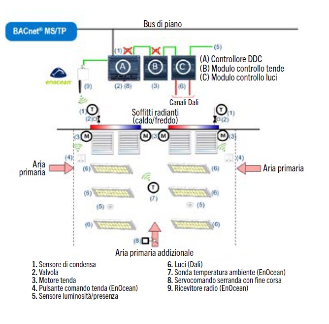 L’impiego di sensori e interruttori wireless Enocean senza batterie – facilmente installabili, removibili e riutilizzabili – e di regolatori BACnet MS/TP posizionati a soffitto – che gestiscono ventilconvettori, ventilazione e illuminazione artificiale – asseconda la modularità degli spazi. La logica master/slave tra controllori ambientali consente un’elevata scalabilità e flessibilità.