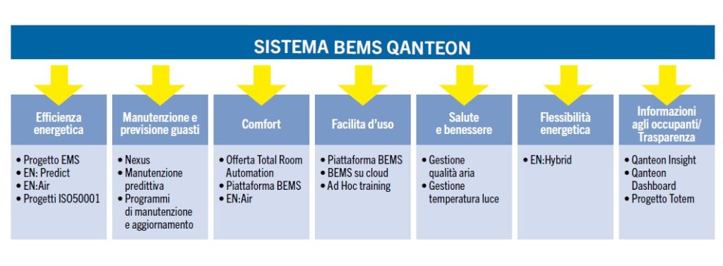 Il BEMS si occupa di supervisione, controllo e monitoraggio de­gli impianti meccanici ed elettrici, di alcuni impianti speciali, dell’automazione degli ambienti e dell’integrazione funzionale e gestionale dei sistemi di terzi. In fase d’esercizio il sistema è supportato da un approccio manutentivo orientato al migliora­mento continuo, per contribuire al miglioramento dell’efficienza, della sicurezza e della sostenibilità nel tempo.
