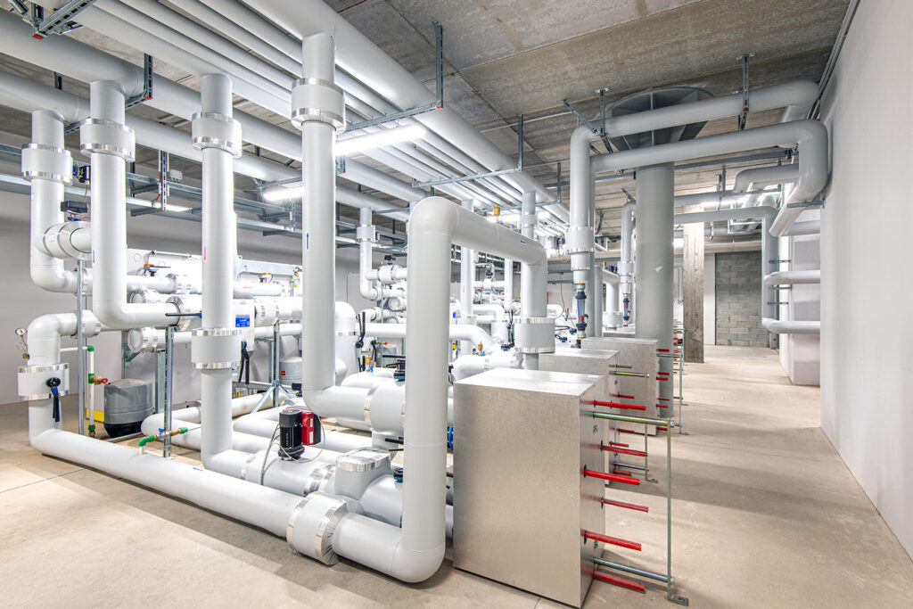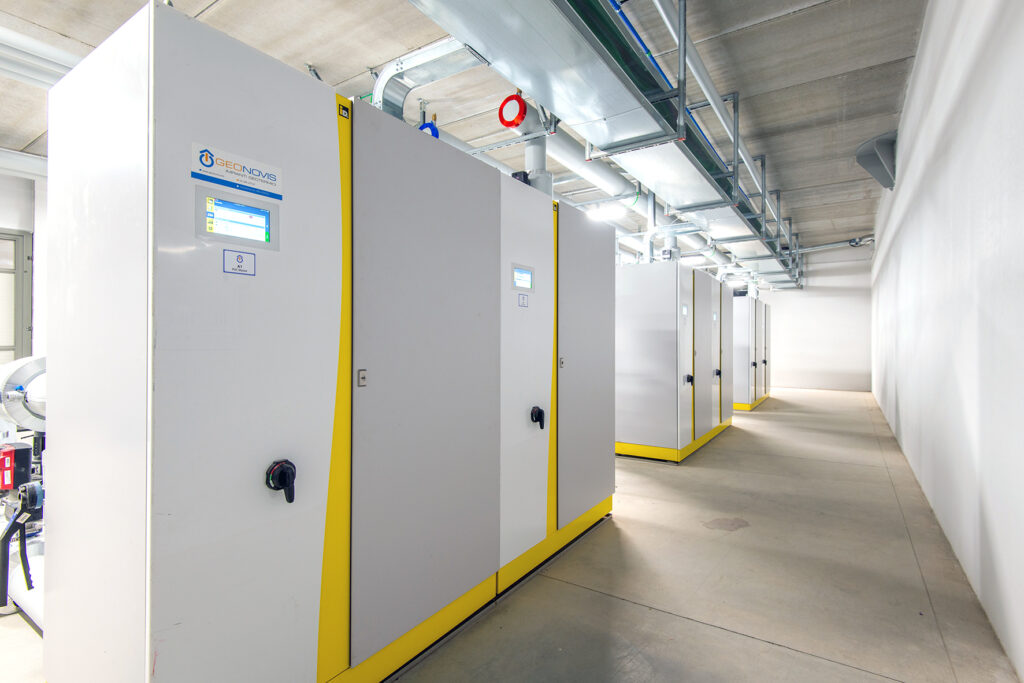 A valle degli scambiatori di calore (uno per ogni circuito geotermico), la centrale termofrigorifera è configurata in maniera modulare, composta da 3 pompe di calore (ciascuna: 345 kWt; 315 kWf) che funzionano in cascata per la copertura dell’intero fabbisogno termico e frigorifero (potenza complessivamente installata: ~1.035 kWt; ~945 kWf). Equipaggiate con doppio circuito e con doppio compressore, le pompe di calore (COP = 5,79; EER = 4.79) operano in due fasi, perciò con un minor numero di procedure di avviamento a carico parziale e con una ridotta carica di refrigerante R410A.