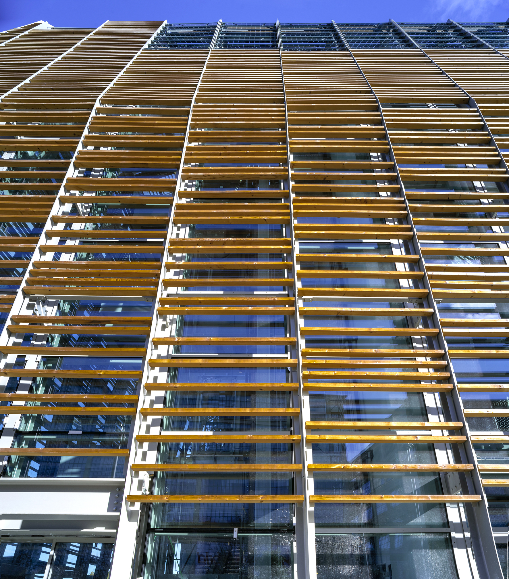 Il progetto architettonico mette a sistema un performante involucro trasparente – che avvolge il volume edificato, dalla base alla sommità – con una struttura a montanti metallici che sorregge una fitta trama di lamelle in legno naturale, conferendo massa ai prospetti e proteggendo le vetrate dall’irraggiamento solare, senza precludere la penetrazione della luce naturale e la visione del panorama urbano.