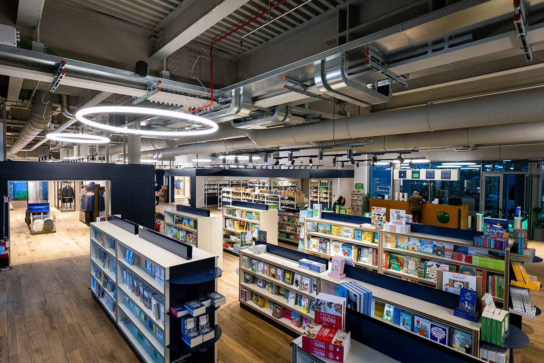 Le aree di vendita e gli altri servizi sono perciò climatizzati mediante un impianto ad aria primaria, in funzione del numero di utenti presenti e degli altri carichi interni. Le reti di distribuzione generale sono realizzate con canalizzazioni metalliche a sezione rettangolare, mentre le canalizzazioni di immissione in ambiente, a vista, sono sempre in materiale metallico, microforate a sezione circolare. Tutte le reti impiantistiche a soffitto sono in vista.