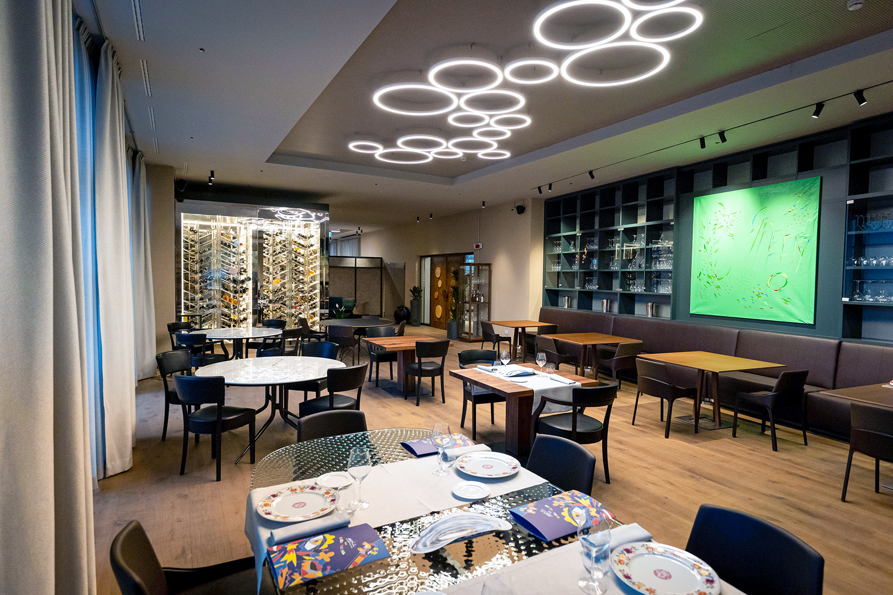 - ristorante formale (mandata e ripresa 6.500 m3/h, con recupero del calore), con distribuzione dell’aria affidata a sottili diffusori lineari inseriti nei controsoffitti;