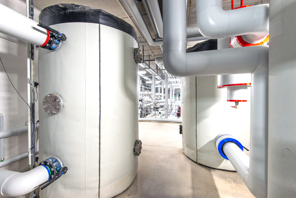 La presenza di 3 accumuli inerziali (ciascuno 5.000 l), per lo stoccaggio dell’acqua a 7 °C e a 50 °C, concorre a ottimizzare il sollevamento dell’acqua dalla falda e i consumi elettrici prelevati dalla rete di distribuzione. Le temperature impostate segnano una curva climatica tale da soddisfare i requisiti di comfort.