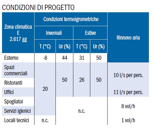 Le aree di vendita e gli altri servizi sono perciò climatizzati mediante un impianto ad aria primaria, in funzione del numero di utenti presenti e degli altri carichi interni. Le reti di distribuzione generale sono realizzate con canalizzazioni metalliche a sezione rettangolare, mentre le canalizzazioni di immissione in ambiente, a vista, sono sempre in materiale metallico, microforate a sezione circolare. Tutte le reti impiantistiche a soffitto sono in vista.