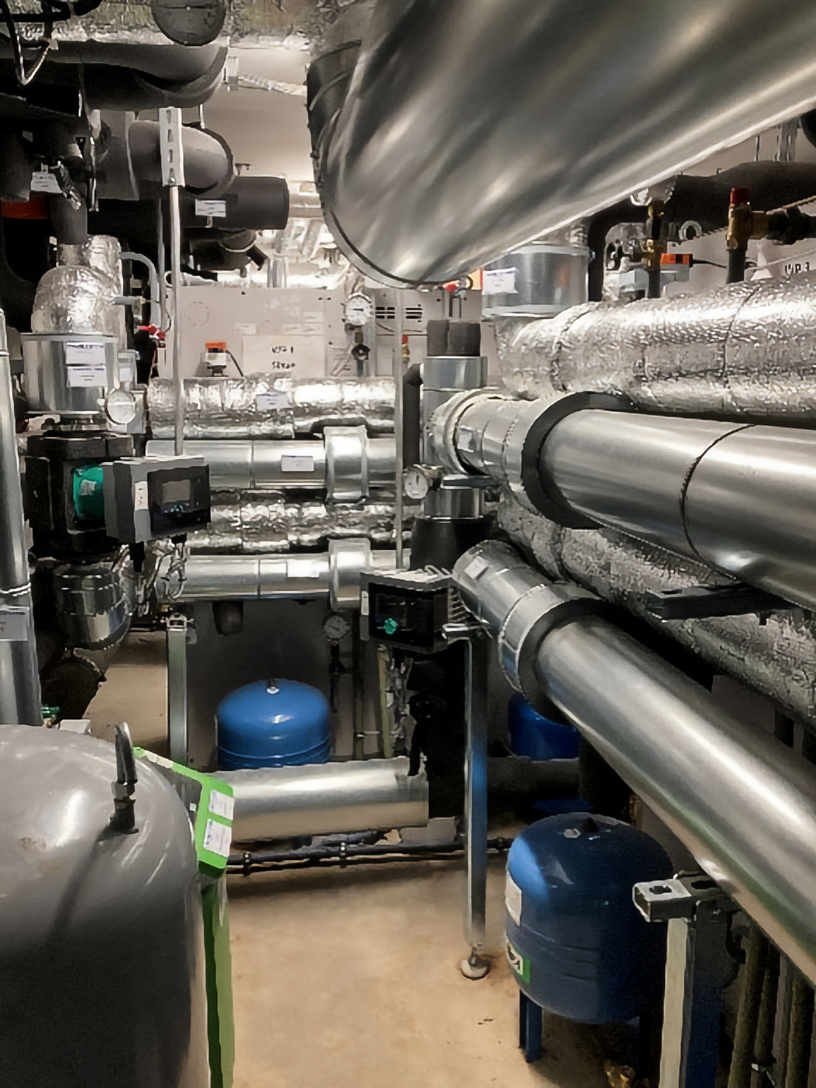 La produzione dei fluidi caldi e refrigerati è affidata a 4 pompe di calore monovalenti prodotte da iDM Energiesysteme, tutte collegate al campo geotermico. Il progetto impiantistico ha privilegiato il ruolo degli accumuli ad alta capacità (complessivamente 4 serbatoi termostatici da 2.200 l ciascuno, di cui 2 per riscaldamento e 2 per raffrescamento), con l’obiettivo di ottimizzare il funzionamento delle pompe di calore.