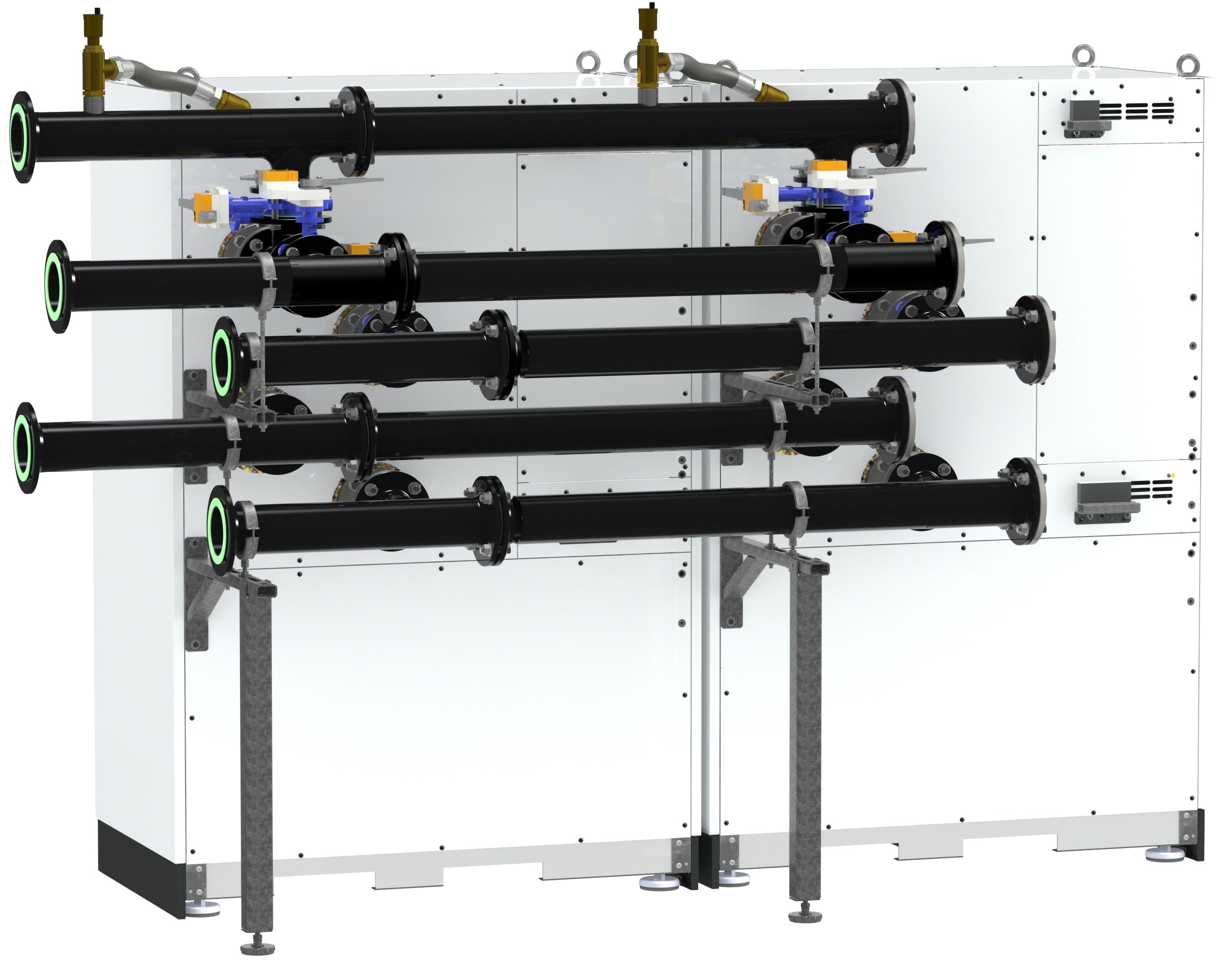 Le versioni di TERRA SW Max con potenze ≥ 170 kWt e di TERRA SW Max H con potenze ≥ 140 kWt – come quelle installate presso Luisenhöhe – dispongono di 4 circuiti frigoriferi separati e ridondanti, per garantire una potenza adeguata al fabbisogno e la massima continuità di funzionamento. Sono composte essenzialmente da due generatori distinti, collegati alla parte posteriore attraverso tubazioni per facilitare l’installazione in spazi ristretti. Il circuito di raffreddamento è allacciato alla pompa di calore lato sorgente, per offrire il raffreddamento continuo del circuito.