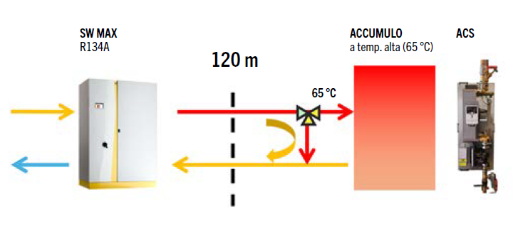 Più complessa si è rivelata la soluzione per la fornitura dell’ACS, in quanto le sottostazioni presenti nel complesso alberghiero sono alimentate dagli accumuli a 65 °C situati nella centrale termofrigorifera, distante circa 120 m. La soluzione adottata prevede un ingegnoso sistema di gestione delle valvole, che si aprono solo quando si raggiunge la temperatura desiderata per caricare l’accumulo ad alta temperatura.