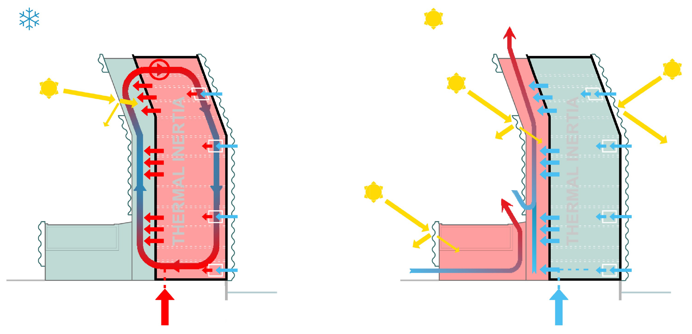 Al fine di fornire condizioni adeguate alle opere, la temperatura nelle aree espositive è mantenuta a 21 °C con un’umidità relativa del 50%. Il controllo del microclima è affidato a impianti a tutt’aria con unità di piano che garantiscono un’elevata flessibilità di funzionamento. Per il trattamento dell’aria esterna immessa negli ambienti vengono utilizzate due diverse strategie a seconda della stagione (figura 6). Durante l’inverno l’aria estratta dalle sale espositive transita nella zona dinamica dove si riscalda e per effetto camino sale verso l’alto fino ad arrivare al locale tecnico ubicato all’ultimo livello. Da qui viene convogliata verso le unità di piano che trattano una miscela di aria di ricircolo e di aria esterna prelevata in facciata. Durante l’estate, invece, l’aria estratta dalle sale espositive transita nella zona dinamica dove si riscalda e stratifica fino alla copertura dove viene espulsa, mentre le unità di piano trattano esclusivamente aria esterna prelevata in facciata.