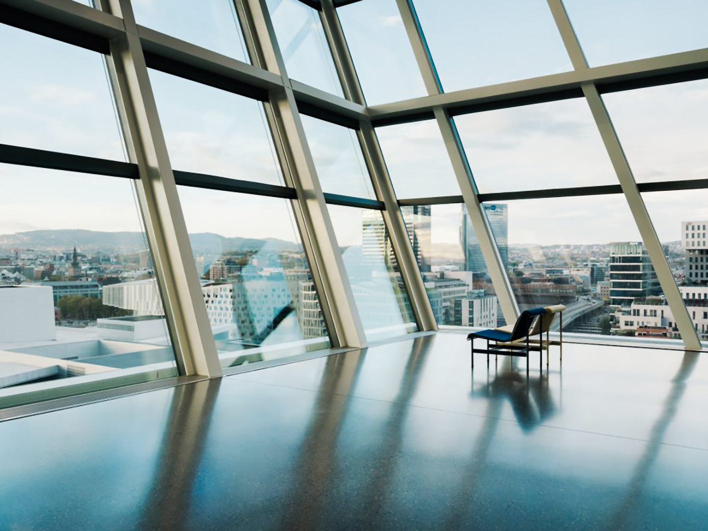 La torre poggia su un podio che si sviluppa su tre livelli. Il primo è destinato a funzioni pubbliche come l’area del foyer di ingresso (figura 3), il negozio del museo, i guardaroba, una caffetteria e un piccolo anfiteatro circondato da una parete di vetro per seminari e proiezioni di film. I due piani superiori ospitano invece una sala per eventi, un ristorante, un bar e una terrazza sulla copertura con vista sulla città e sul fiordo.