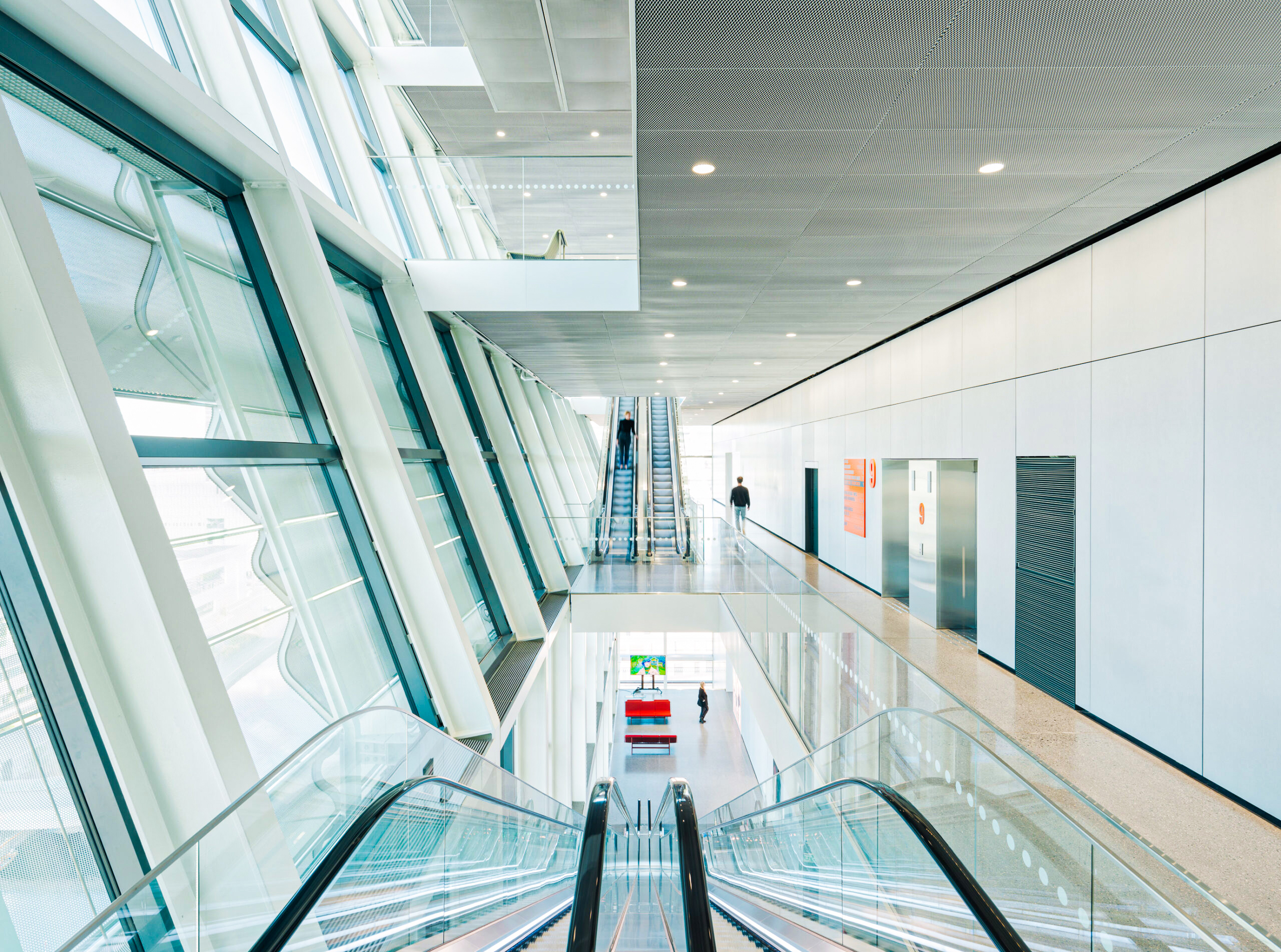 Per il controllo della temperatura nelle giornate più fredde e più calde sono stati in ogni caso previsti convettori a pavimento installati lungo la facciata alimentati con acqua calda o fredda a seconda della stagione. Lo stesso sistema è stato utilizzato per trattare l’ultimo livello della torre completamente vetrato (figura 8). Per la lobby di ingresso del podio si sfrutta invece la ventilazione naturale attivata mediante l’apertura di lucernari poste sulla copertura.