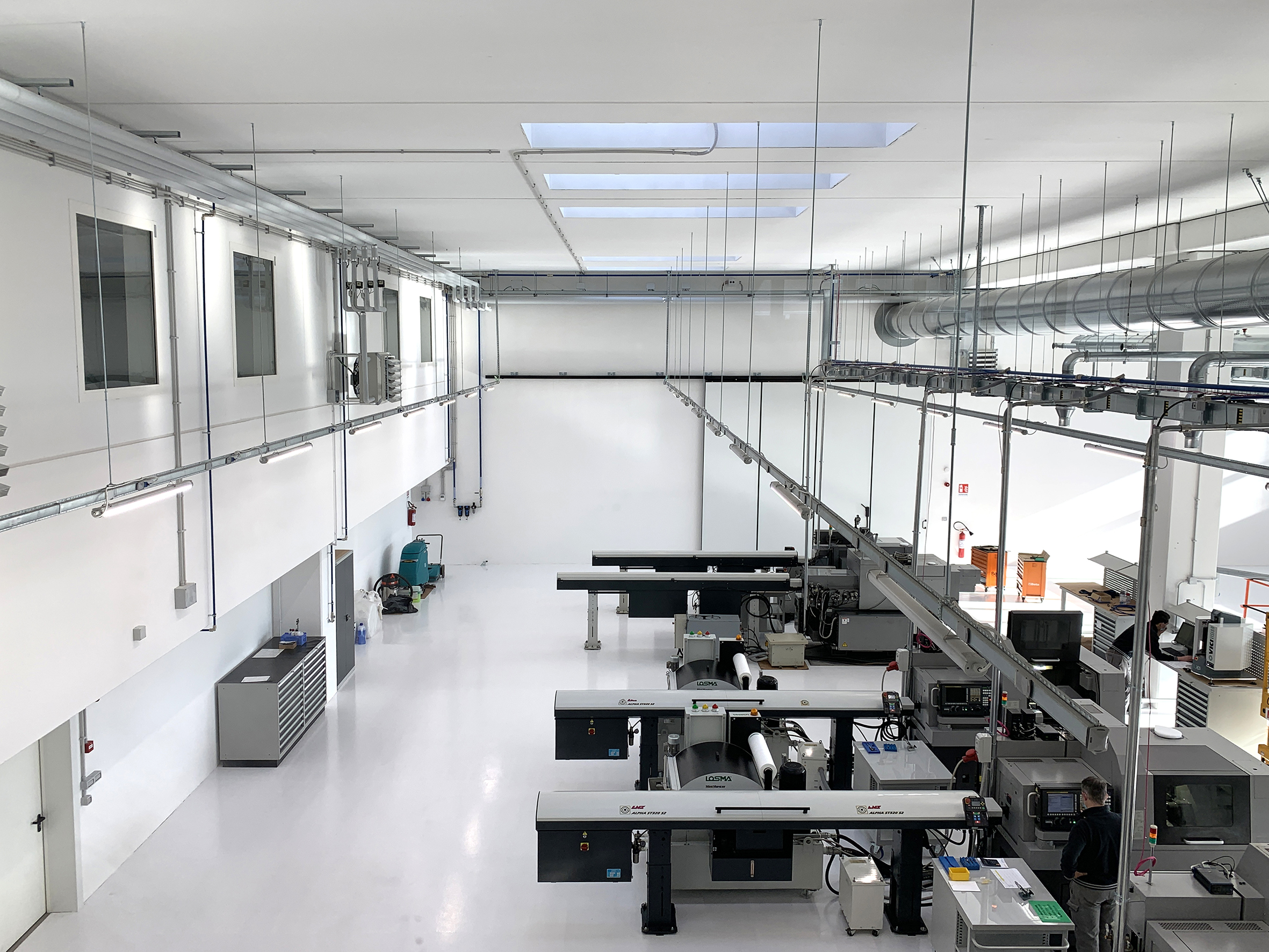 Gli spazi interni sono caratterizzati da superfici candide e da ampie vetrate, che inondano gli ambienti con luce naturale e che permettono la visione di quanto avviene nell’area produttiva. Al secondo piano un patio scoperto offre la possibilità di relax all’aperto. I principali locali tecnici si trovano sulla copertura piana (centrali termofrigorifera e trattamento aria, oltre all’impianto fotovoltaico da circa 60 kWp) e al piano terreno (sottocentrale).