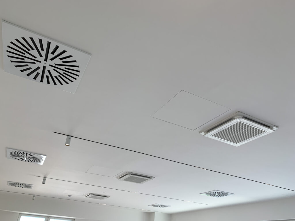 - mandata mediante diffusori lineari a più feritoie installati a controsoffitto (sale conferenza e formazione) e diffusori quadrangolari ad alta induzione (mensa, ecc.);
