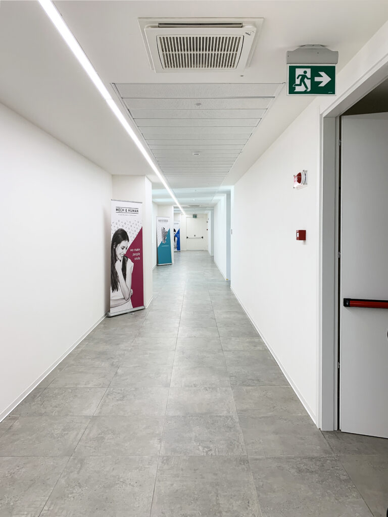 Situato in una zona industriale a breve distanza dall’autostrada A4, il nuovo quartiere generale di Mech & Human è un edificio dall’immagine contemporanea, con asse principale allineato in direzione nord-sud, che si sviluppa tre livelli ciascuno dedicato a una funzione principale. Il piano terreno è introdotto dalla hall d’ingresso ed è eminentemente destinato all’attività produttiva, con officina meccanica, magazzini (materie prime, prodotti finiti), locale per misurazioni e qualità, customer care, spogliatoi del personale, al piano terreno.