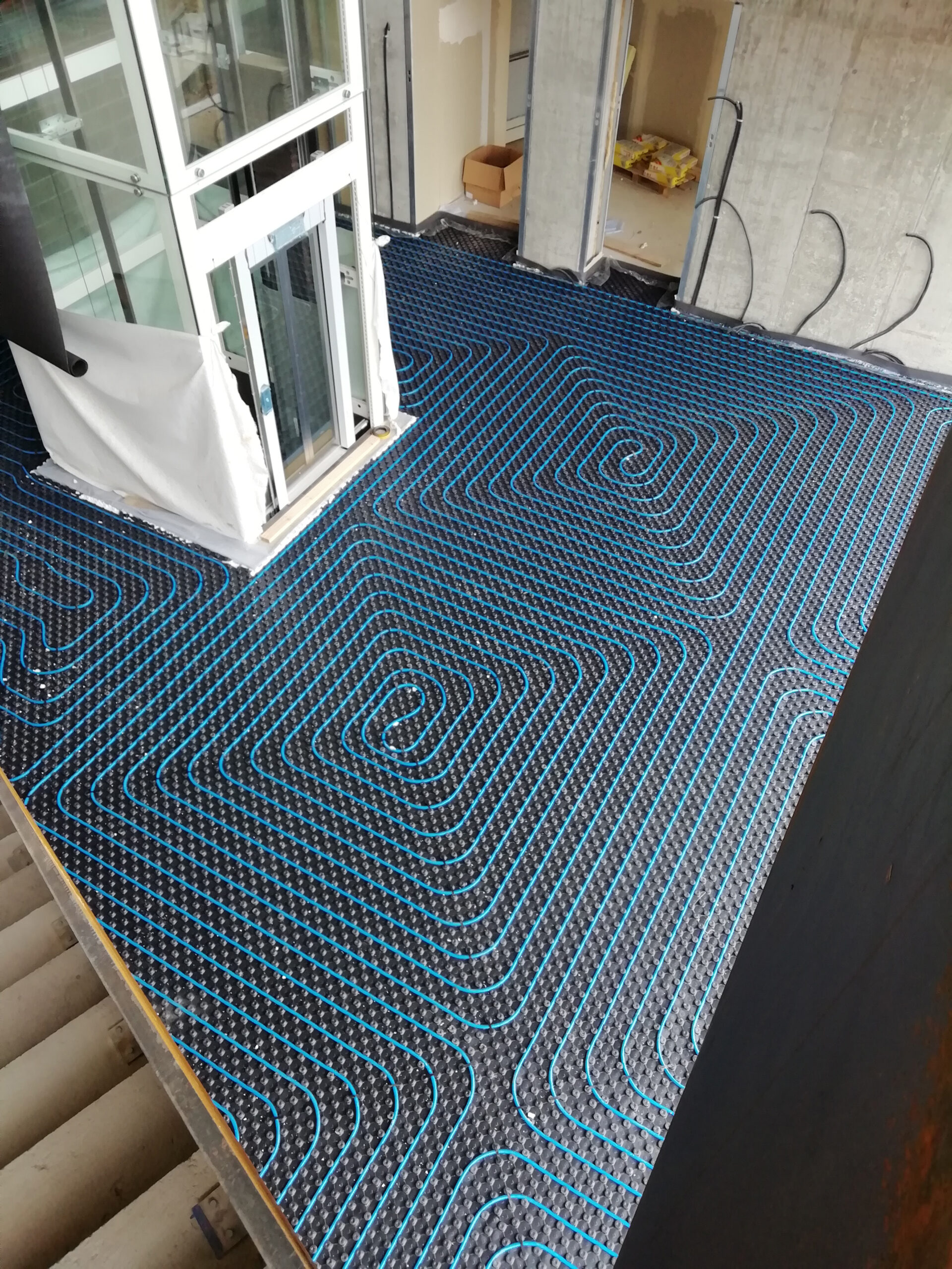 - pavimento radiante per solo riscaldamento, con tubazioni in pex posate su lastre di isolante preformato ribassato, per compensare le ampie superfici fredde costituite dalle vetrate;