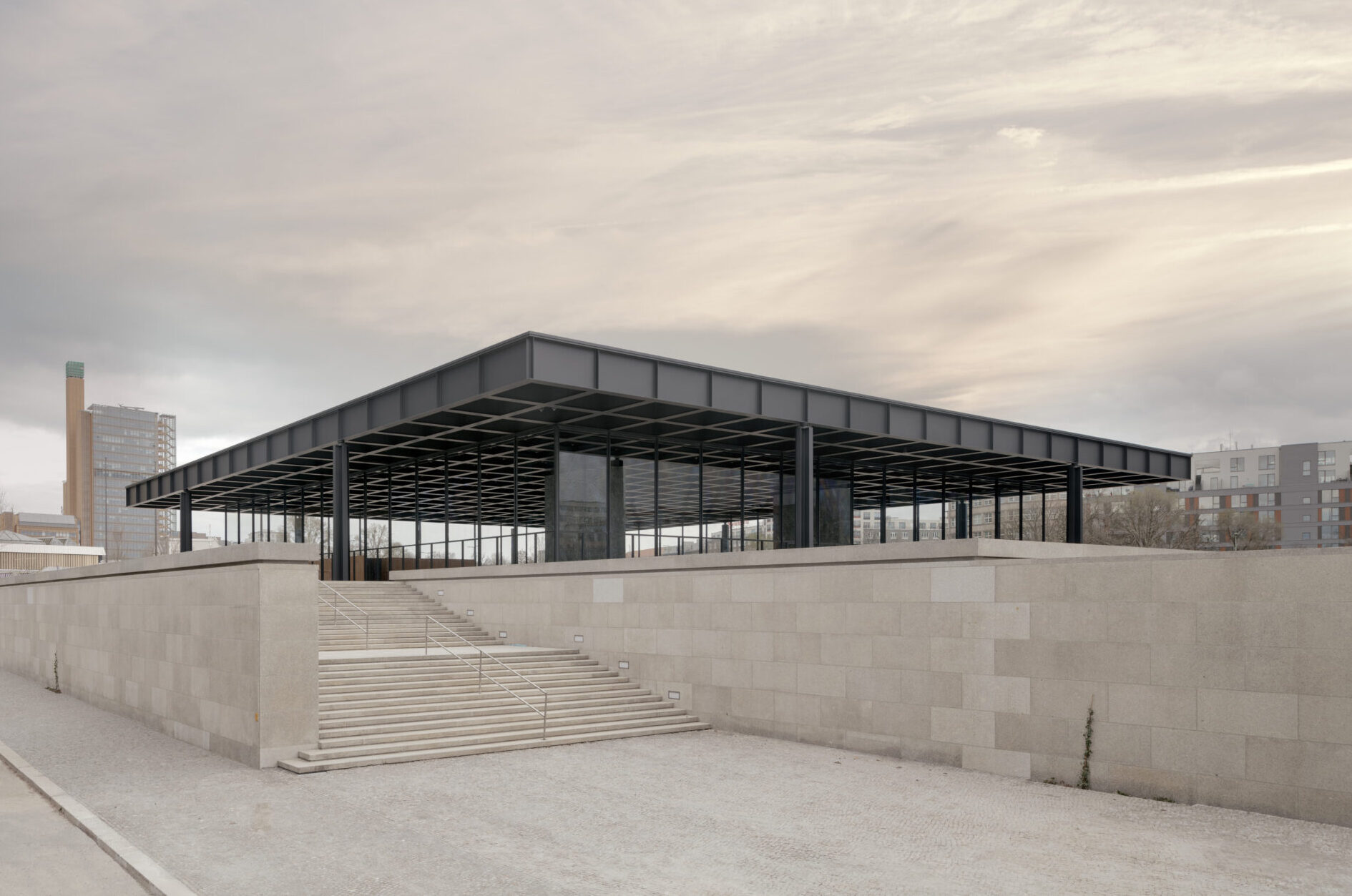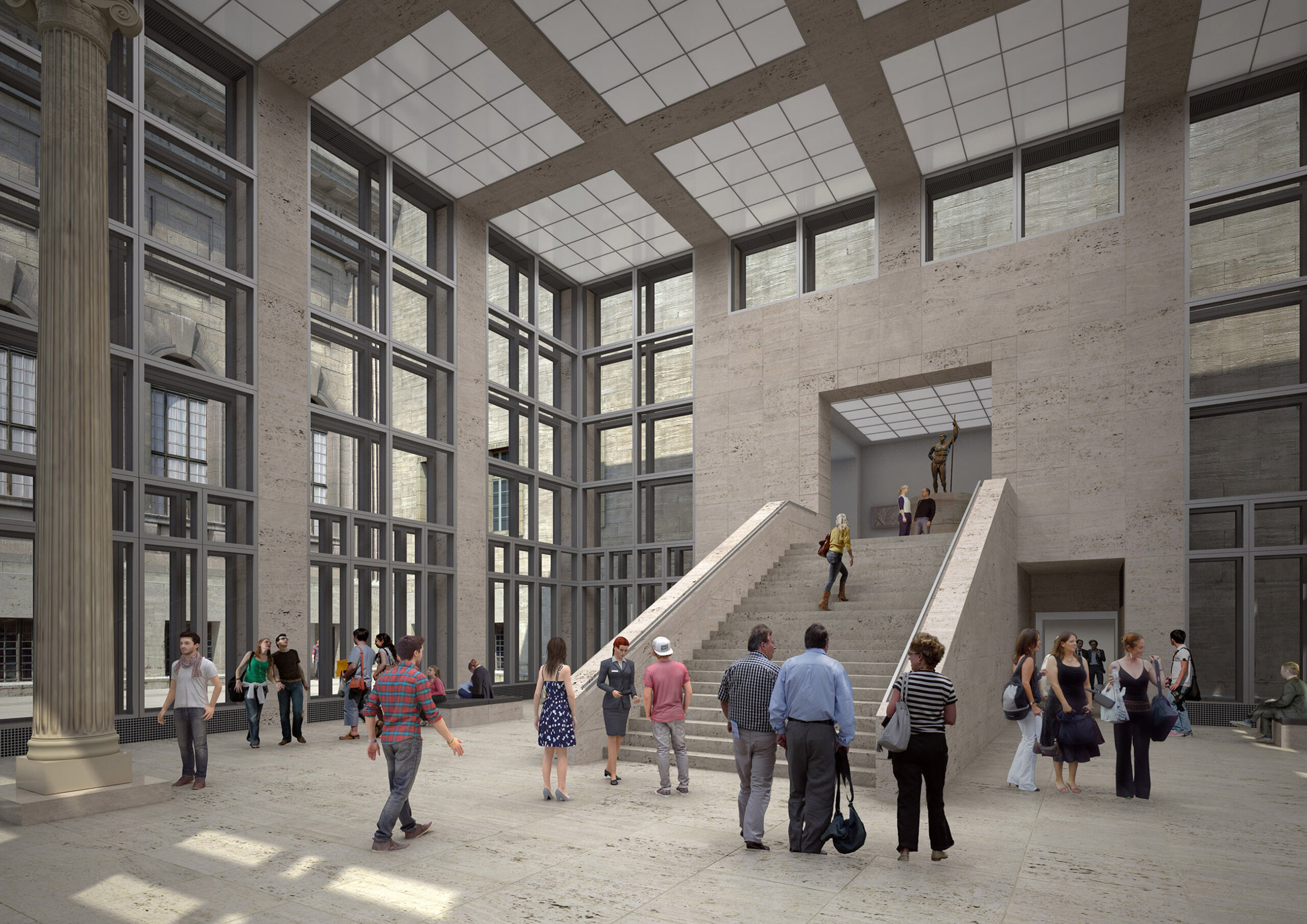 All’esterno il design elegante e contemporaneo ha richiesto un’integrazione del nuovo edificio nello storico complesso esistente. Secondo David Chipperfield, le nuove e sottili colonne in cemento rappresentano una reinterpretazione della passeggiata del colonnato disegnata da Friedrich August Stüler, che collega il Neues Museum con la vicina Alte Nationalgalerie. La monumentale scalinata esterna è invece un riferimento a quella di Karl Friedrich Schinkel che porta all’Altes Museum.