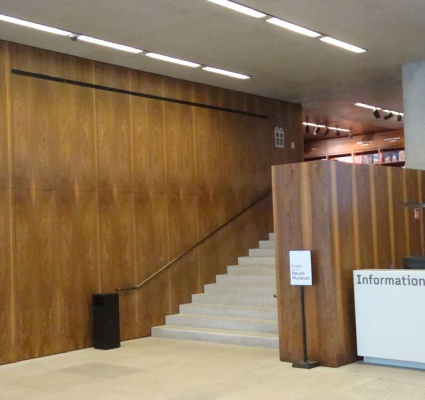 Per quanto riguarda il sistema di illuminazione, i quasi 2400 corpi illuminanti originali a incandescenza sono stati reingegnerizzati per essere utilizzati con lampade Led: in totale sono state previste 794 luci nello spazio principale (4 per ognuno dei 196 campi definiti dalla struttura del soffitto) e 1.350 luci per il piano interrato, tutte di tipo wall washer, un sistema innovativo e non molto conosciuto in Germania al tempo della costruzione, che crea una luce uniforme sulle superfici espositive, anche grazie alla finitura parzialmente satinata delle lenti.