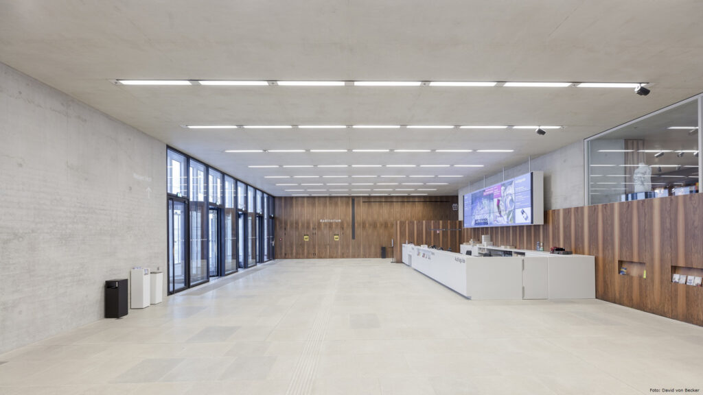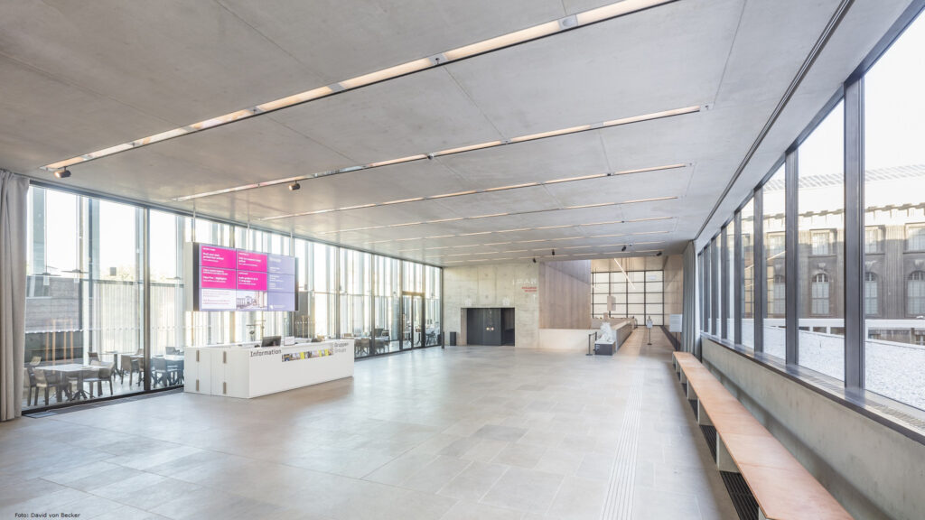 La riqualificazione del sistema di trattamento e diffusione dell’aria è risultata particolarmente sfidante e ha richiesto un’intensa collaborazione tra architetti e ingegneri del clima durante le varie fasi di concept, progettazione e realizzazione. I diffusori lineari ad alta induzione sono stati adottati a seguito di un dialogo intenso e costruttivo. La ragione di scelta è da ricercare non solo nel ridotto impatto estetico, ma anche nelle particolari caratteristiche funzionali. Ad esempio, l’immissione di un getto d’aria libero impedisce l’accumulo di sporcizia lungo il diffusore e ciò consente di mantenere i soffitti privi di polvere. Inoltre, il rapporto di induzione estremamente elevato assicura un funzionamento senza correnti fastidiose anche con temperature dell’aria di mandata molto basse.