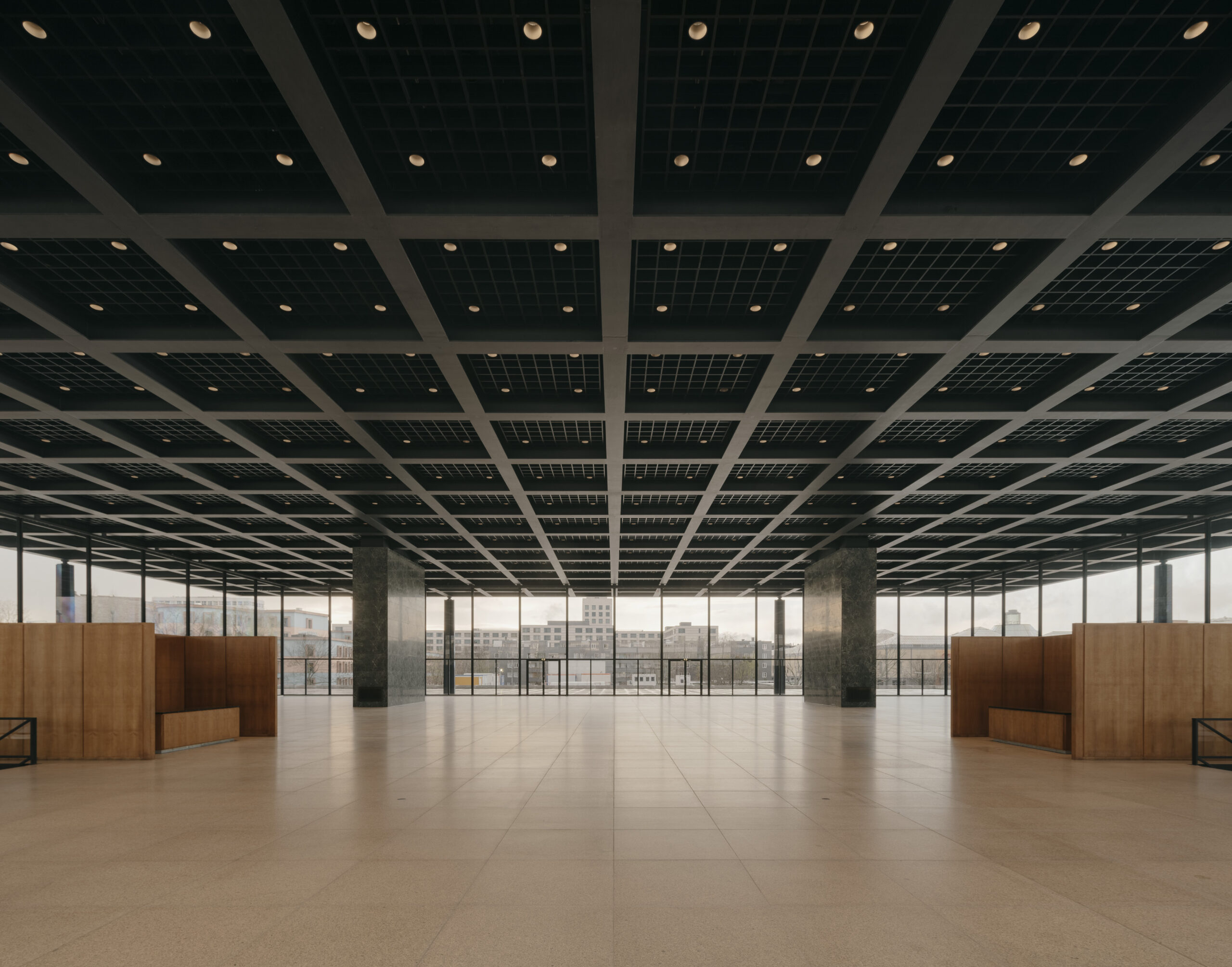 L’ampio atrio d’ingresso, privo di colonne, è circondato da pareti di vetro e si basa su un progetto mai realizzato per la sede della Bacardi a Santiago de Cuba. L’utilizzo di sole due colonne su ciascun lato, per sostenere la copertura in acciaio da 1260 tonnellate, permette di evidenziare le linee pulite della classica architettura moderna (figura 18). La Neue Nationalgalerie sarà l’unico edificio che Mies van der Rohe riuscirà a realizzare in Europa dopo essere emigrato negli Stati Uniti. A causa di problemi di salute, non poté partecipare all’inaugurazione e morì un anno dopo, nel 1969.
