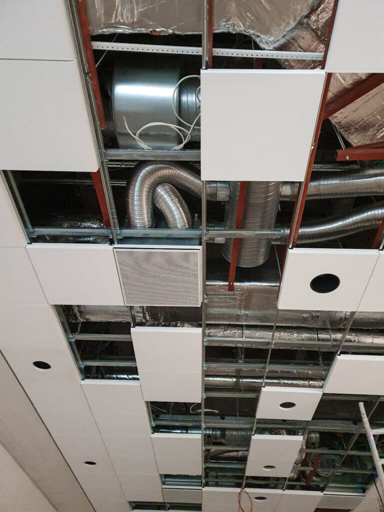 I diffusori sono ad alta induzione di forma quadrata, con piastre frontali e plenum posteriori costruiti utilizzando dimensioni personalizzate. L’installazione discreta di questi vari componenti, inclusi i pannelli metallici forellinati decorativi, si è rivelata molto complessa dovendo integrare la tecnologia di ventilazione nel controsoffitto modulare fuori dalla vista (figura 22).