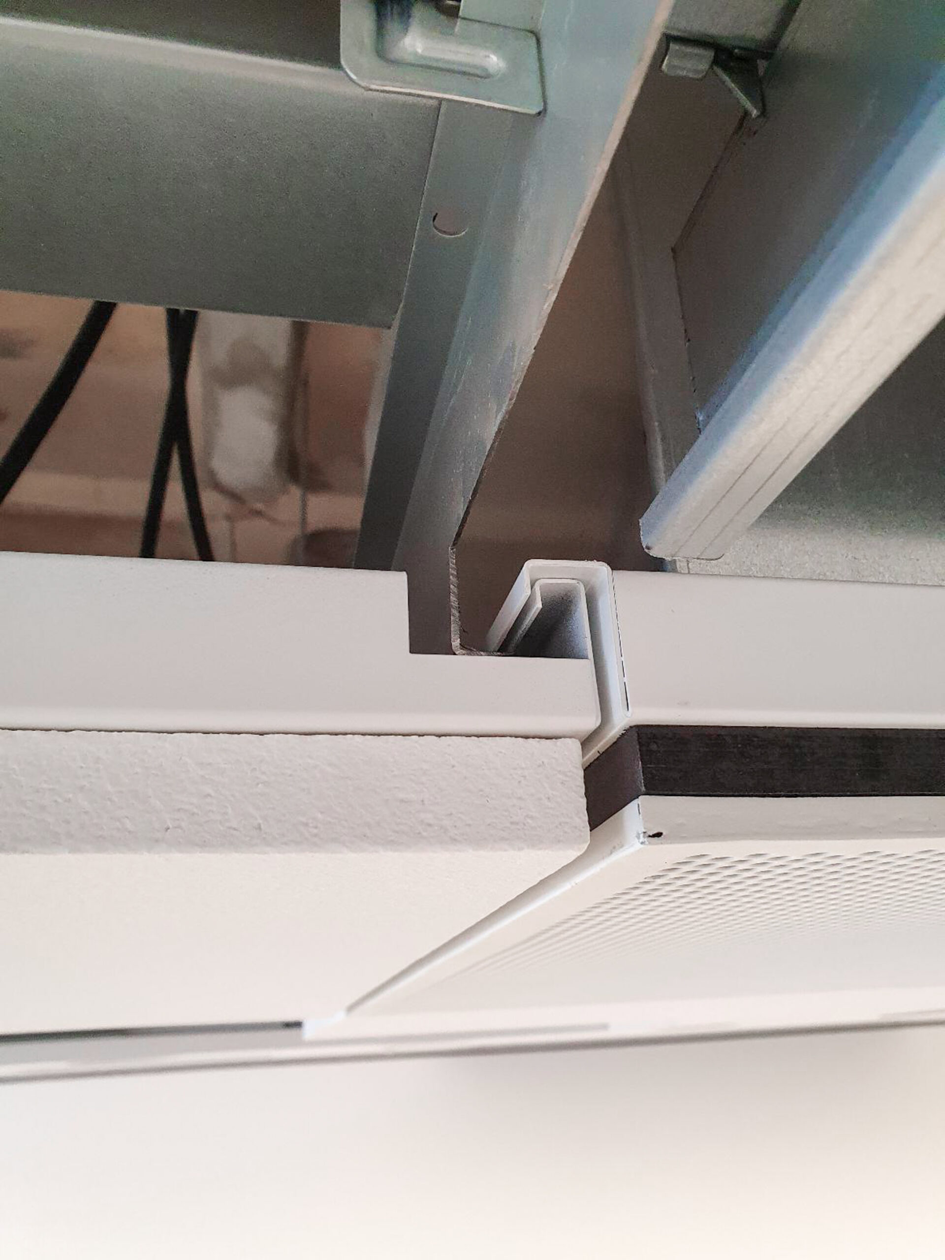 I diffusori sono installati con una leggera inclinazione per garantire la corretta direzione del flusso dell’aria di mandata nell’ambiente (figura 15). Nelle altre sale i diffusori sono stati installati a soffitto lungo la facciata vetrata (figura 16).