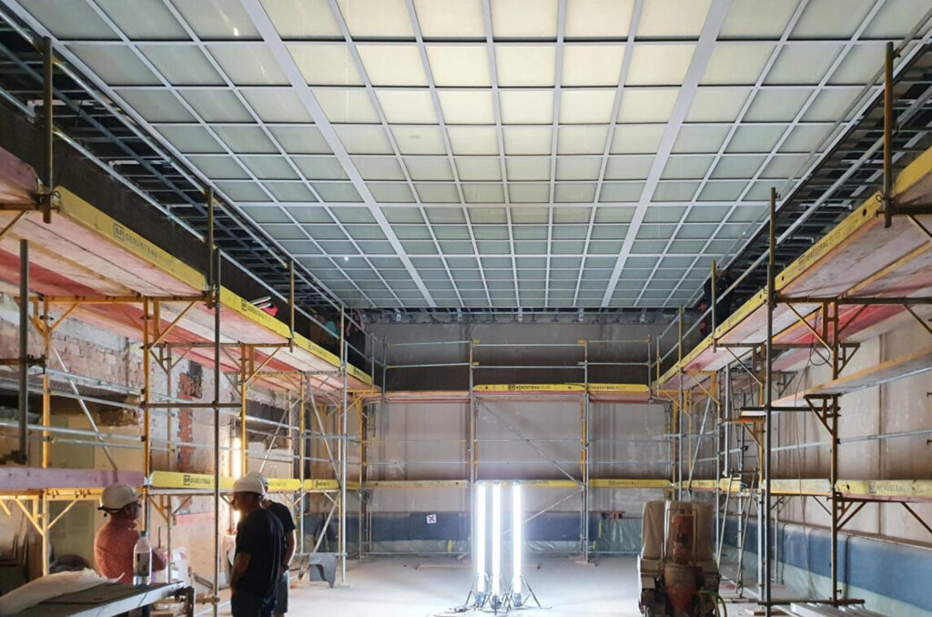 Il controsoffitto esistente era costituito da un sistema modulare di una tipologia che all’epoca era già da alcuni anni in uso negli Stati Uniti mentre era ancora sconosciuta in Germania. Questo controsoffitto modulare ha costituito la base dell’idea di Mies van der Rohe di dare allo spazio espositivo una planimetria flessibile. Nell’ambito della ristrutturazione generale, esso è stato rimosso e sostituito con uno nuovo con lo stesso aspetto (figura 21).
