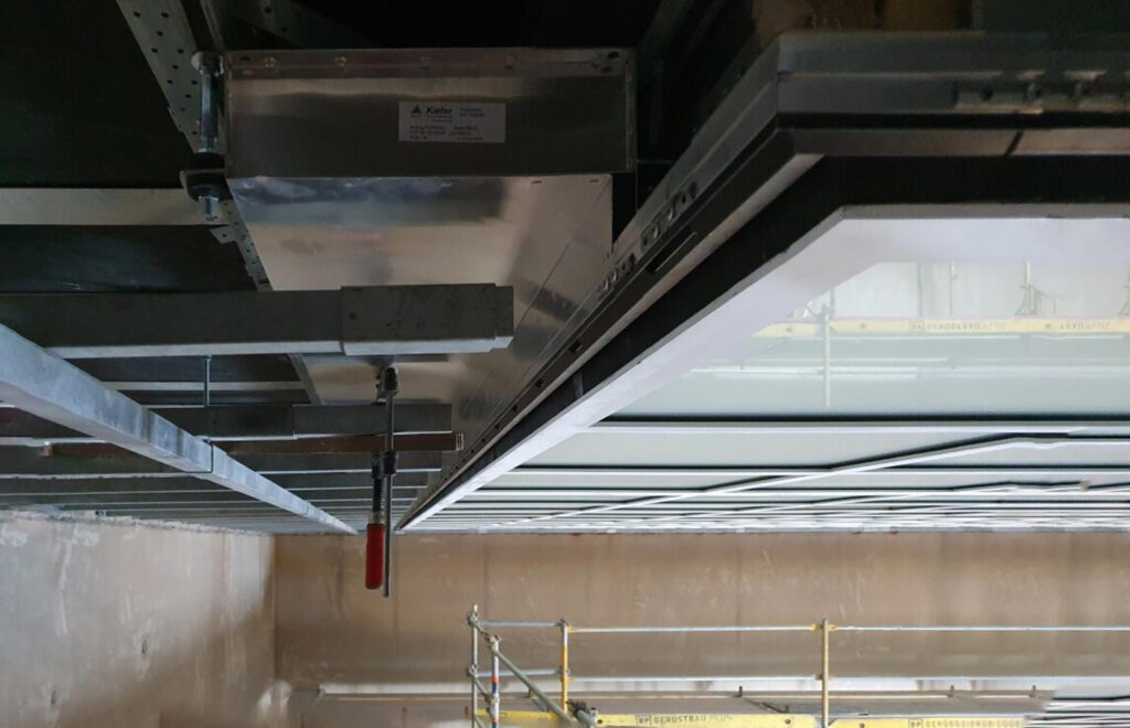 È stato inoltre possibile integrare i diffusori lineari in tutti gli elementi di giunzione dei controsoffitti in modo da ottenere il design desiderato. Essi sono stati posizionati con precisione intorno al bordo del soffitto retroilluminato, di conseguenza risultano praticamente invisibili e soddisfano gli elevati requisiti architettonici (figura 8). Poiché il livello di installazione del sistema di diffusione dell’aria è diverso da quello del soffitto illuminato, per i plenum è stato necessario sviluppare un disegno molto compatto in modo da risparmiare spazio in questa particolare configurazione di montaggio (figura 9).