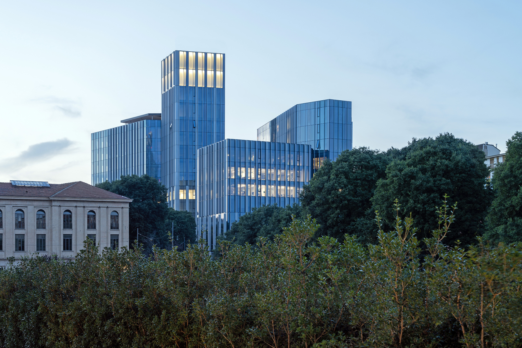 L’involucro edilizio verticale (superficie totale ~33.000 m2; tra­smittanza media complessiva: 1,0 W/m2K) è composto da cellu­le con telaio in alluminio a taglio termico e doppia vetrocamera ad alte prestazioni, trasparenti (fattore solare 30%) e opache (serigrafia al 100%). L’immagine architettonica è ingentilita da lamelle frangisole metalliche, disposte in verticale e aggettanti rispetto alle specchiature, dalla profondità crescente con l’altez­za dei volumi.