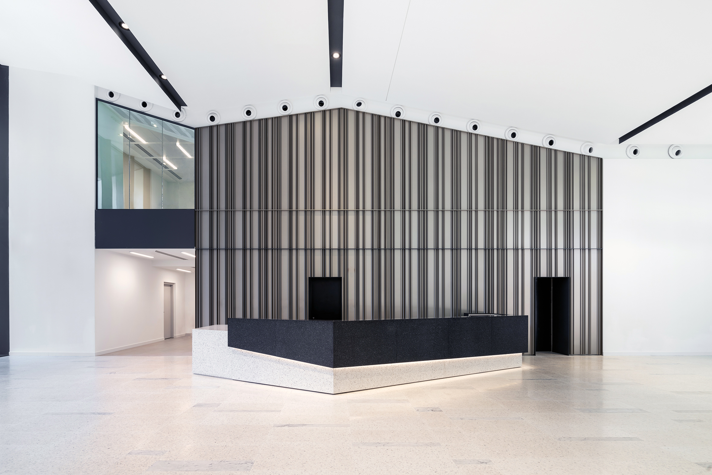 Situata in posizione baricentrica, la hall principale è climatizzata da pavimenti radianti (solo riscaldamento) e da un impianto a tutt’aria con immissione mediante ugelli orientabili
