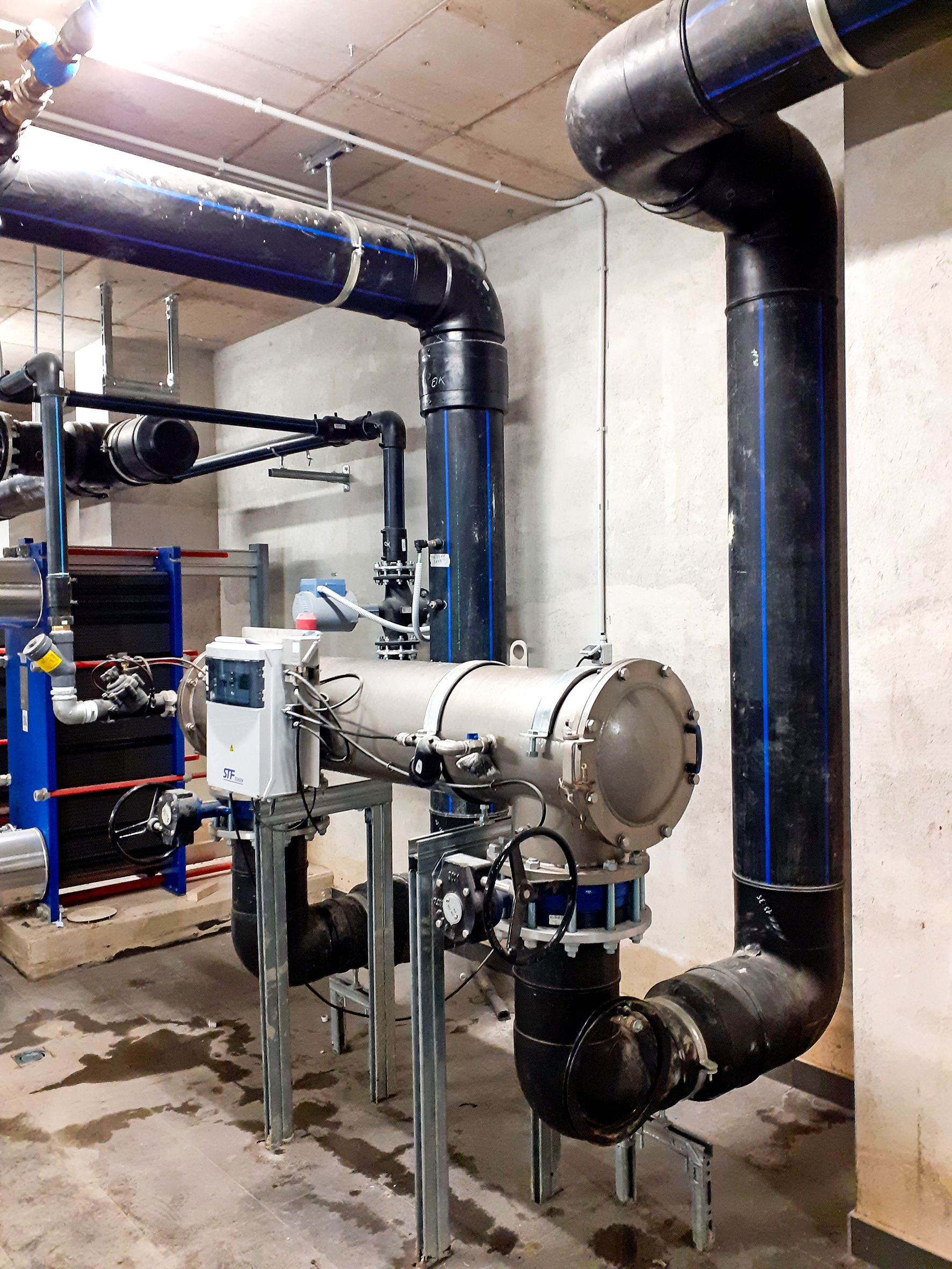 La resa dell’acqua utilizzata avviene a T ≥20 °C attraverso altri 5 pozzi. Tutti i pozzi sono situati nell’intercapedine perimetrale, posta al piede dell’edificio, e sono collegati da tubazioni in pead al filtro autopulente, ai 2 scambiatori di calore (ciascuno 2.100 kW, di cui uno di riserva) e quindi ai generatori. In caso di ne­cessità, l’impianto ad acqua di falda alimenta la rete duale per usi non potabili.