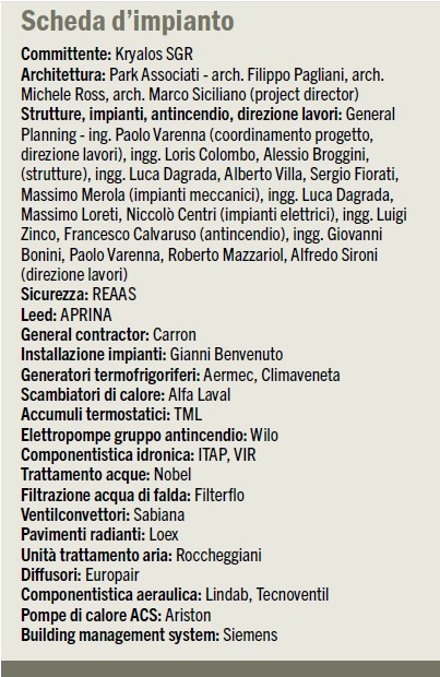 Da qui la necessità, ad esempio, di realizzare un impianto di distribuzione dell’aria decentralizzato, con 3 UTA per piano; la realizzazione di una cabina di trasformazione MT/BT per le utenze condominiali, di una cabina di trasformazione MT/BT per una torre e lo spazio per una seconda cabina di trasformazione utente; i locali predisposti per l’aggiunta di ulteriori 2 gruppi elettrogeni oltre a quello condominiale, oltre che la contabilizzazione dei fluidi caldi e freddi delle singole porzioni di piani».