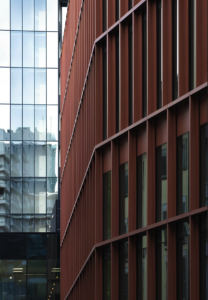 Il concept che ne è derivato prevede la rimozione dell’ala centrale per accogliere un volume sospeso che sovrasta una nuova corte pubblica, un gesto architettonico deciso che apre l’edificio alla città e ne migliora la fruibilità. La nuova corte, chiave di volta del progetto, crea un continuum visivo e funzionale tra la Biblioteca degli alberi Milano (Bam), via Bordoni e gli spazi pubblici adiacenti, trasformando l’ex sede Telecom in un vero e proprio hub di connessioni. Il rivestimento esterno è stato ridisegnato con facciate a doppia pelle vetro metallo, caratterizzate da lame orientabili che fungono da brise soleil e by pass di ventilazione naturale, riducendo l’apporto solare e migliorando il comfort termico estivo.