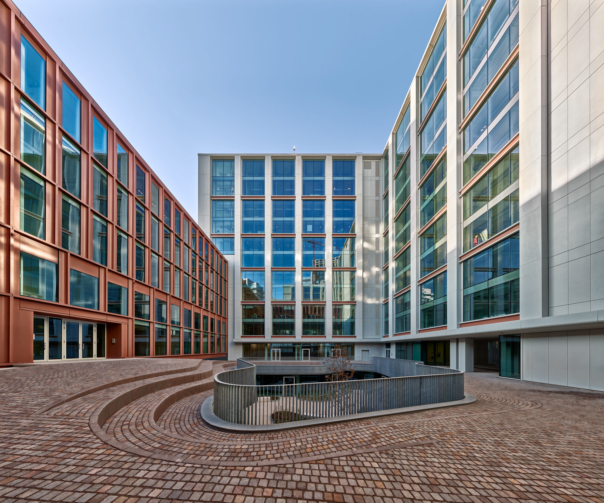 L’approccio architettonico e impiantistico è finalizzato a massimizzare la qualità del comfort indoor. Le facciate a tripla pelle vetro vetro metallo e la stratigrafia isolante garantiscono un’inerzia termica elevata e un elevato livello di isolamento acustico (RW ≥ 50 dB). I sensori di Cov monitorano le emissioni di composti organici volatili derivanti da mobili e finiture, mentre i diffusori ad anello perimetrali assicurano una ventilazione naturale assistita, riducendo l’uso delle macchine durante la mezza stagione.