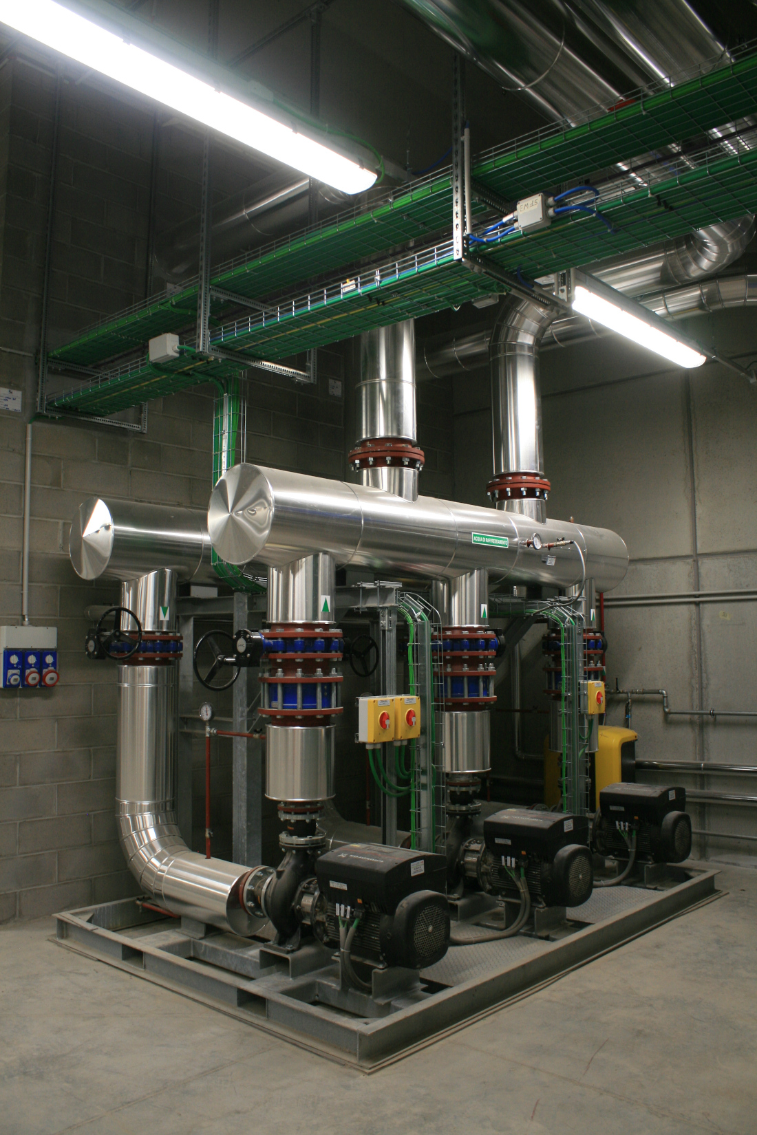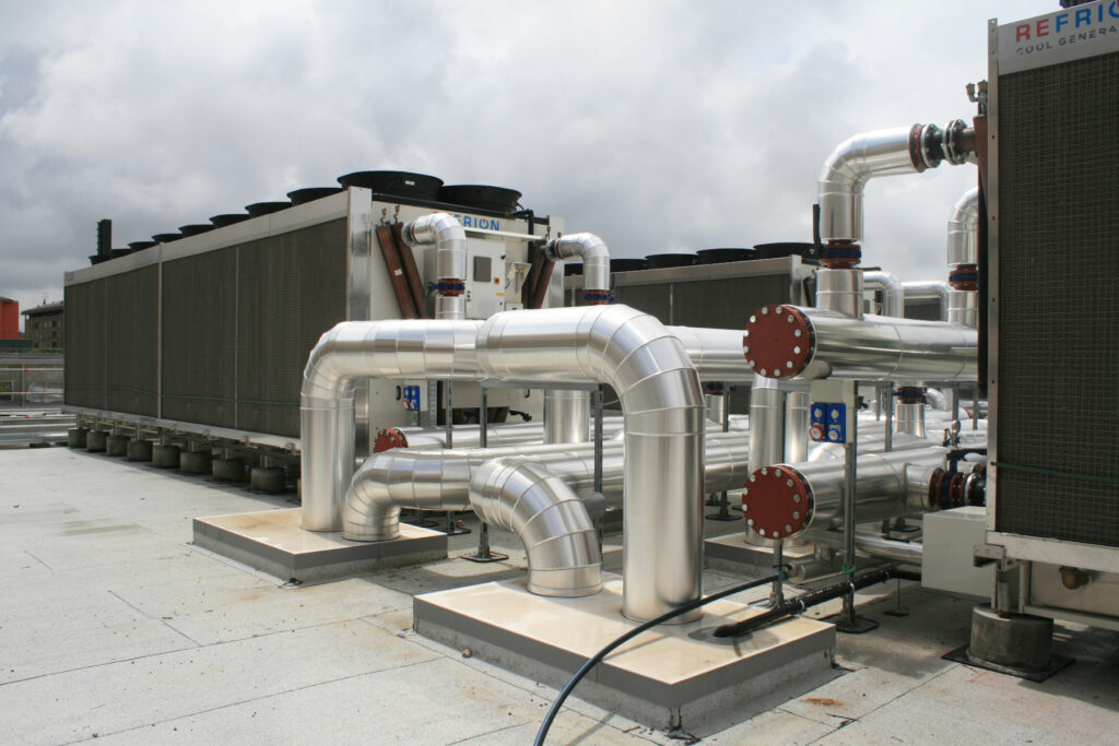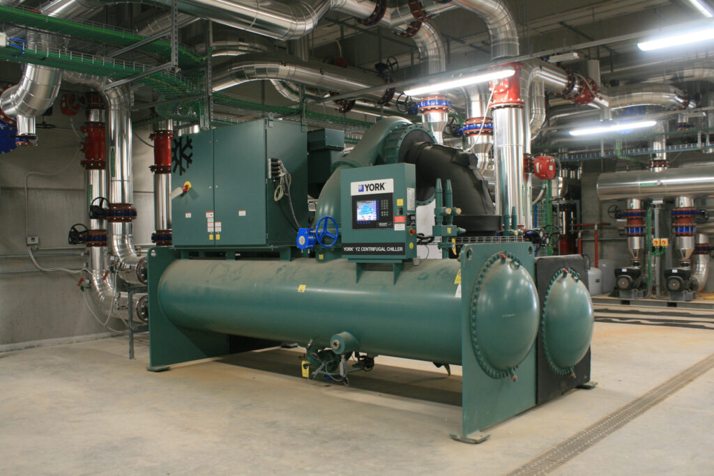 - 1 chiller con compressore centrifugo a levitazione magnetica e condensazione ad acqua, azionato da inverter (2.100 kWf; EER 7,43), che si innesta sul collettore del circuito secondario;
