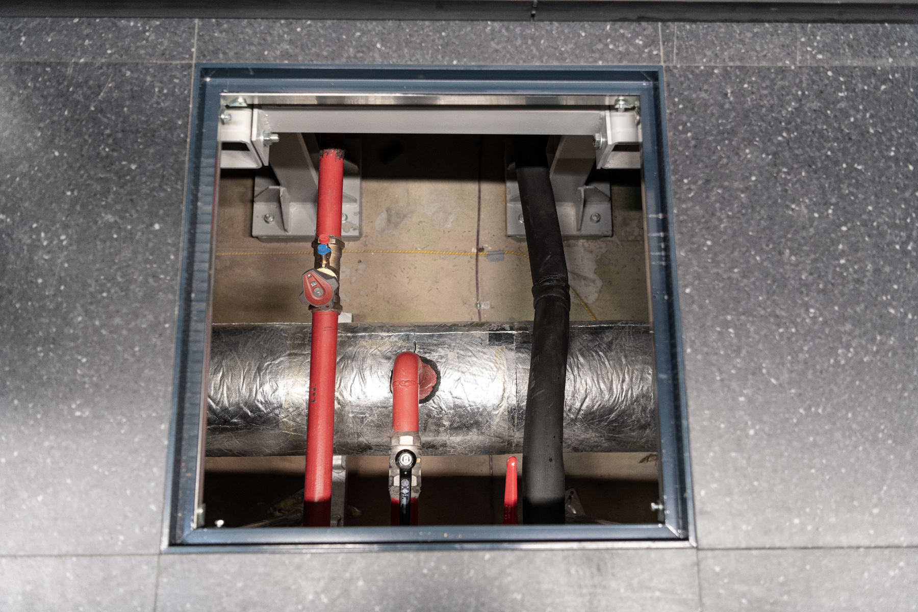 Tutti i locali tecnologici e le sale apparati sono dotati di un impianto di rilevazione delle perdite d’acqua da sistemi di refrigerazione, unità di condizionamento, sistema di distribuzione, ecc., con sensoristica sia di tipo puntiforme, localizzata nei punti più significativi degli ambienti, sia di tipo continuo a nastro, per la segmentazione delle superfici sottopavimento applicata in aderenza alle tubazioni dei circuiti di distribuzione.