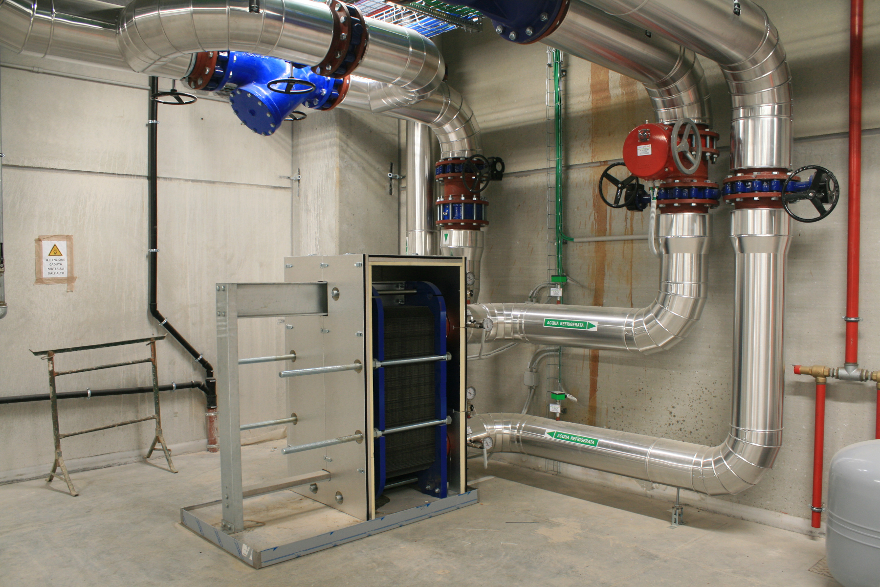 - 1 scambiatore di calore a piastre (2.100 kW), in grado di recuperare quanta più potenza possibile dai raffreddatori adiabatici e, se possibile, inviare direttamente acqua refrigerata alle utenze (free-cooling), nel caso in cui la temperatura di ritorno risulti < 26 °C;
