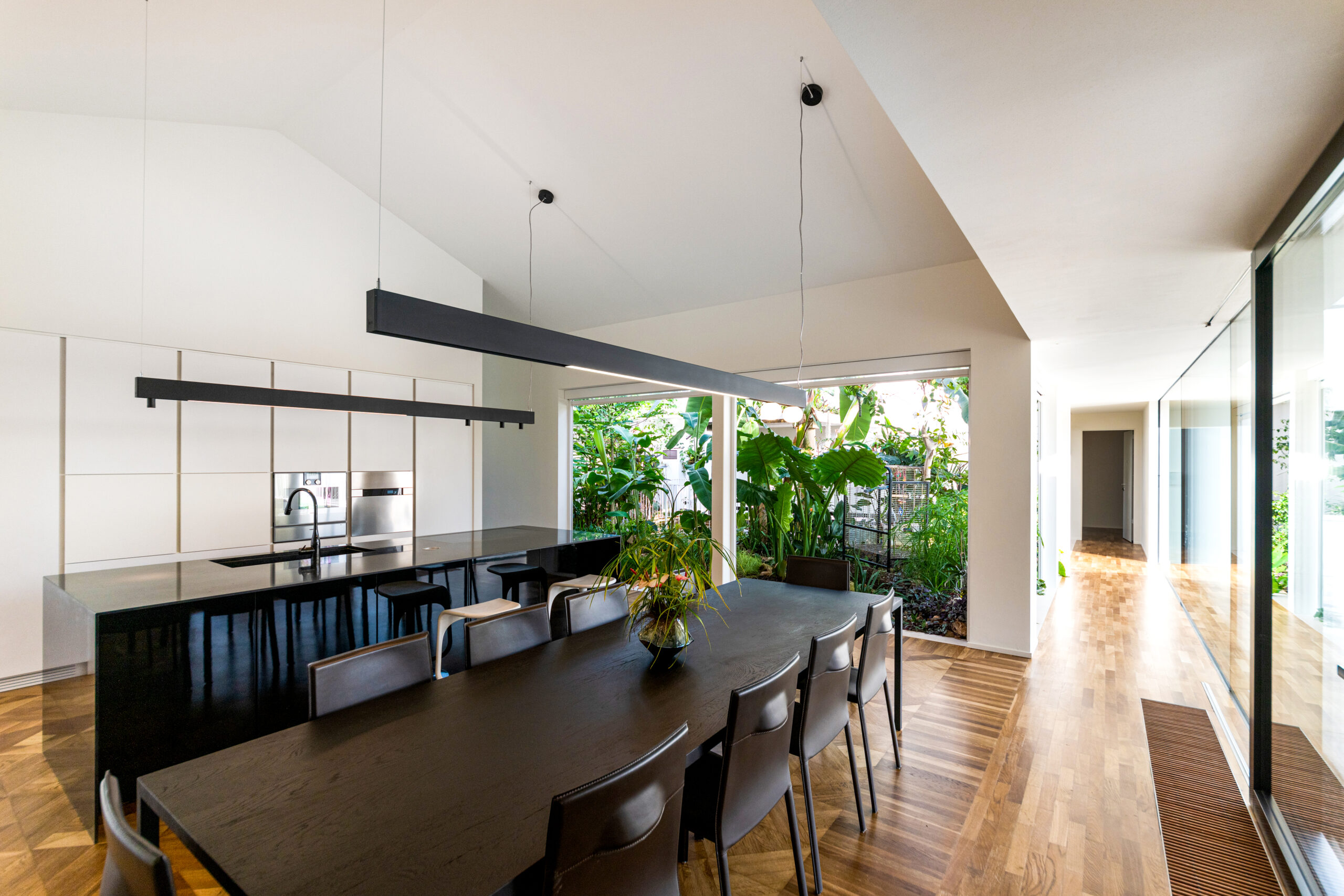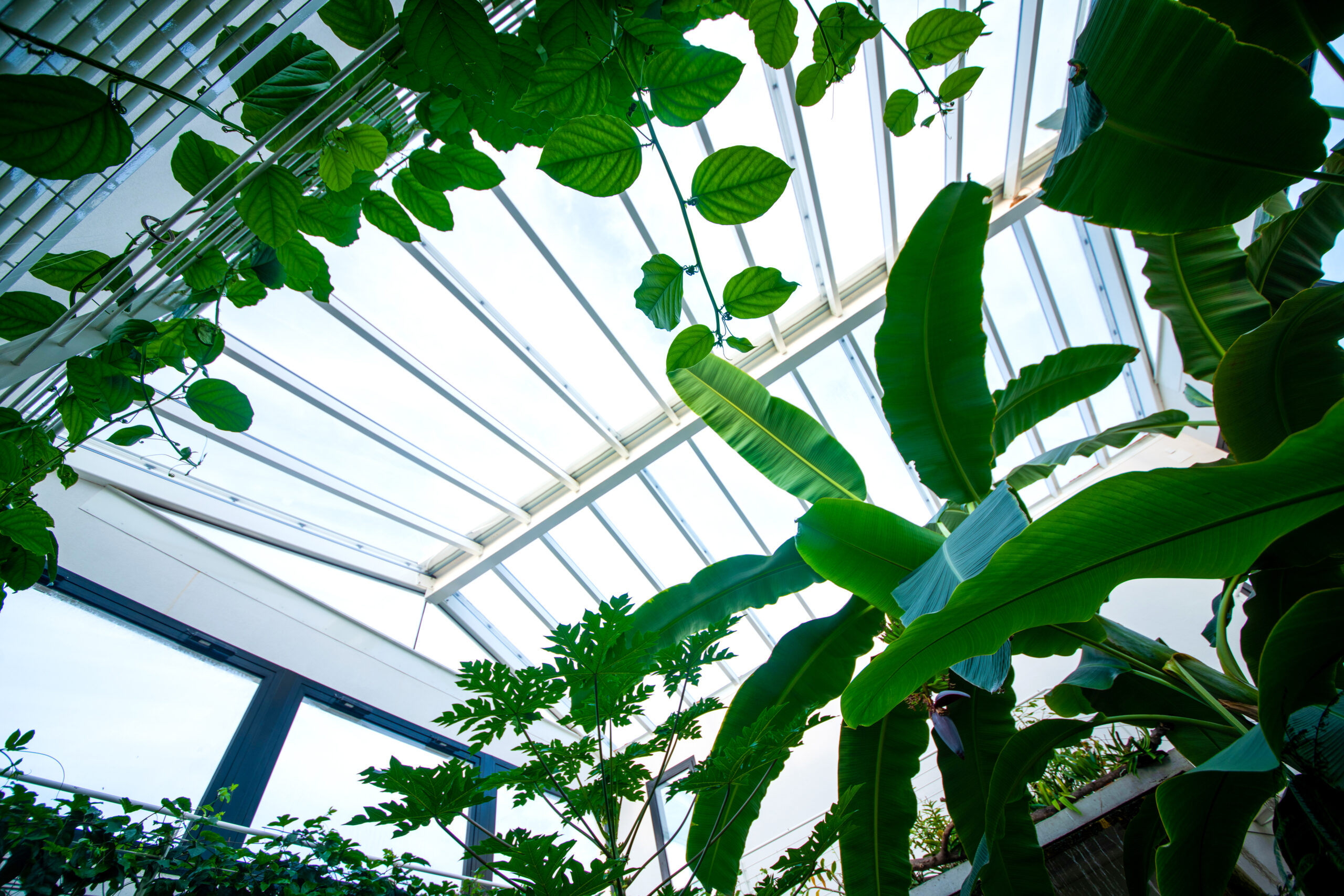Popolata da specie vegetali esotiche, la serra bioclimatica offre un’esperienza immersiva nella natura all’interno dell’abitazione