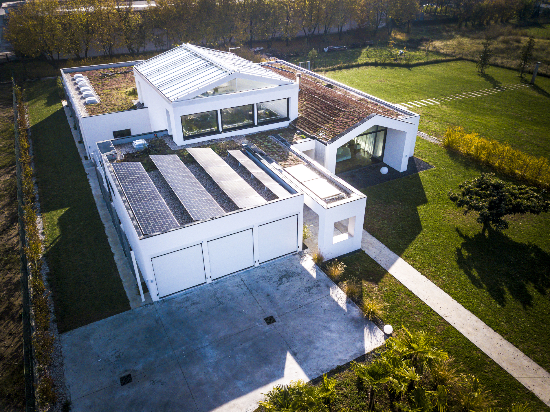 Le strutture edificate sono concentrate nella fascia settentrionale del lotto, prevalentemente occupato dal giardino, con spazi disposti su un unico livello, attorno alla serra a doppia altezza, raggruppati secondo le affinità funzionali. L’accesso si trova lungo il fronte ovest, con il volume del garage posto a protezione del lato nord della pensilina che conduce all’ingresso, attraverso il quale chi entra percepisce subito la rigogliosa presenza della vegetazione.