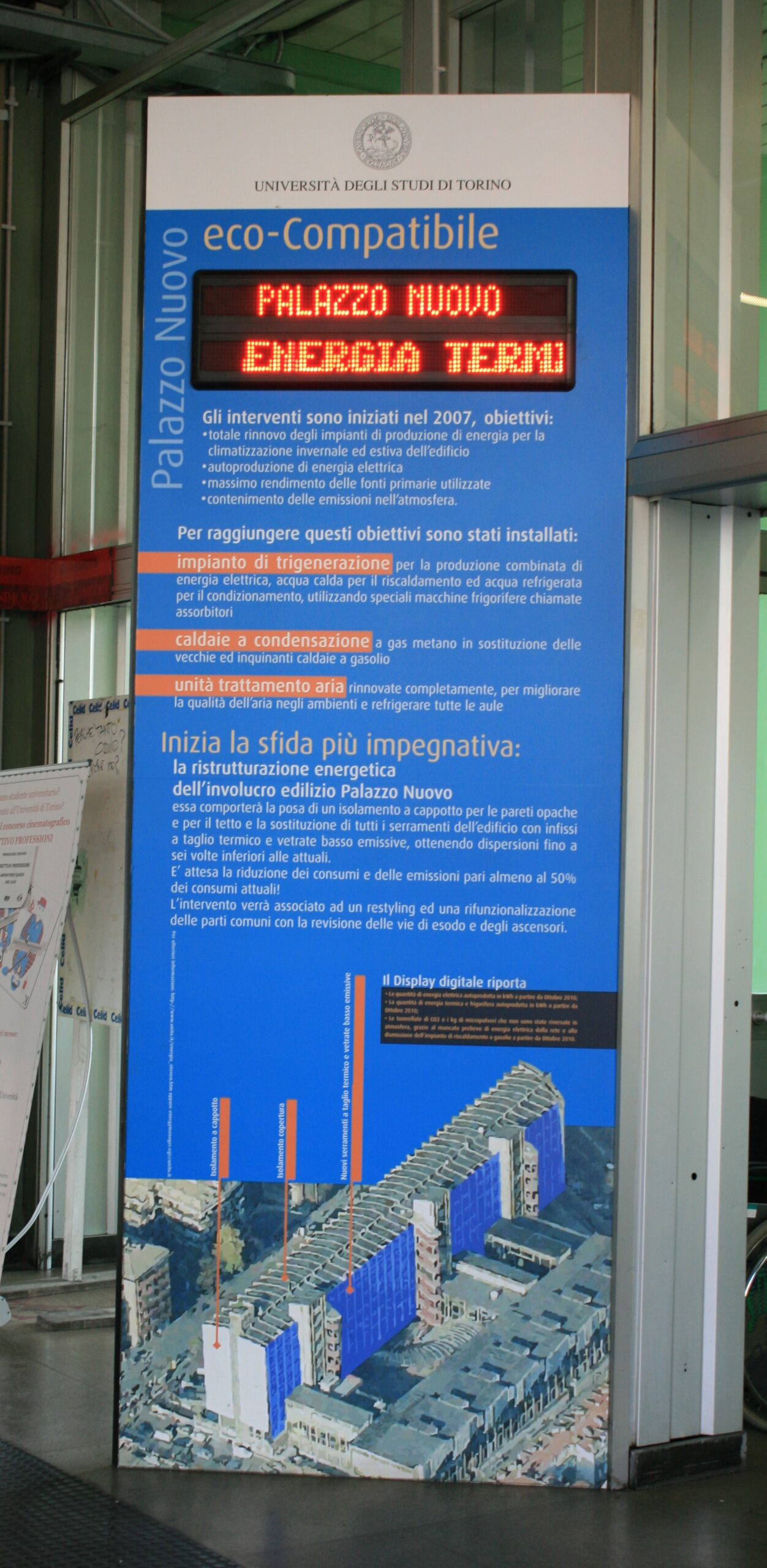 Completato nel 1969 sulla base di un progetto vincitore di un concorso (G. Levi Montalcini, D. Morelli, F. Bardelli, S. Hutter), Palazzo Nuovo a Torino è un esempio di edificio pubblico concepito durante gli anni dell’energia “a basso costo”, caratterizzato in origine da un involucro estremamente trasparente quanto scarsamente performante dal punto di vista termico.