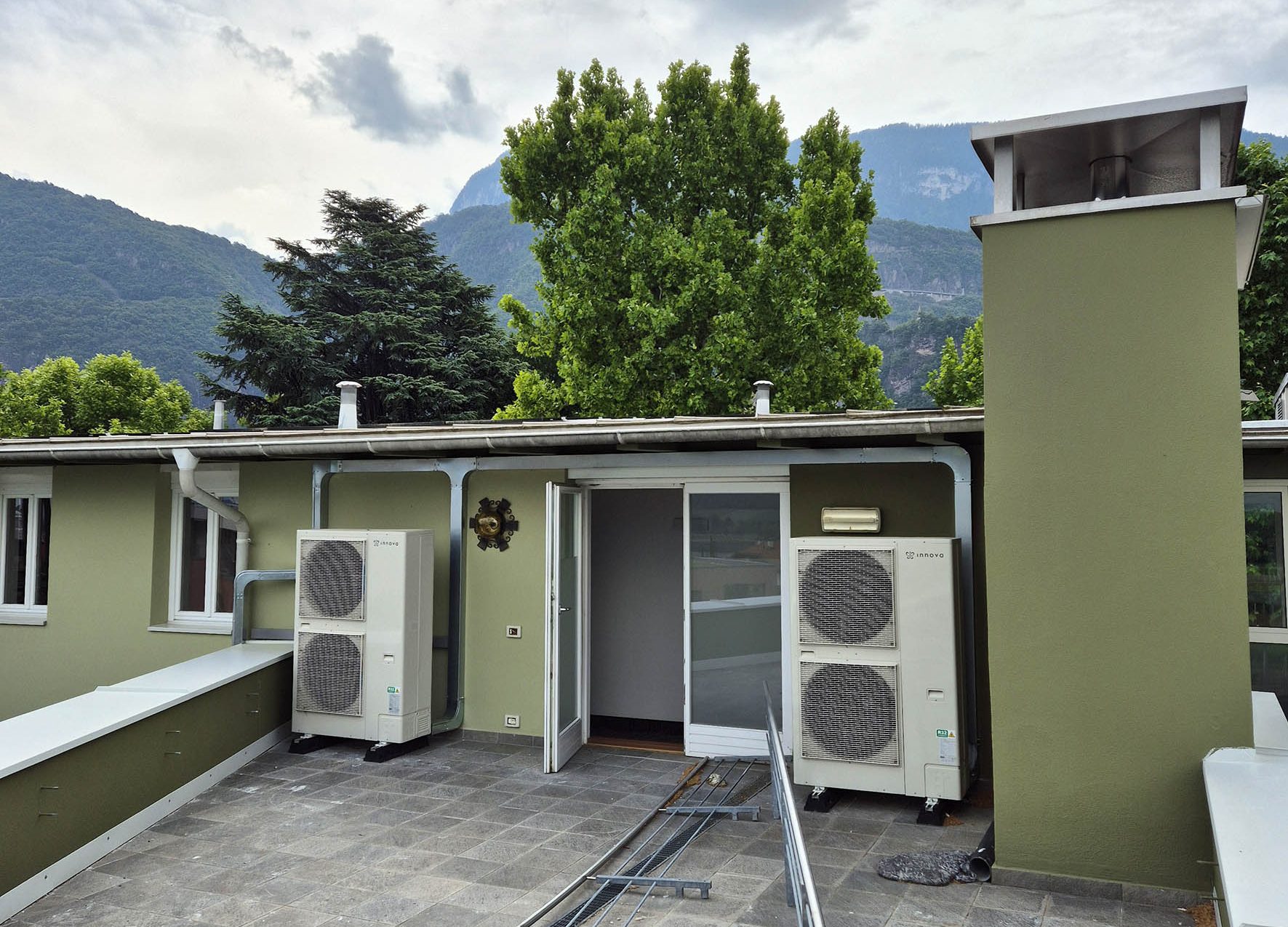 - 2 nuove pompe di calore Innova eHPoca 25T (max 31 kWt @A7/W35 °C; max 23 kWf @A35/W7), composte da motocondensanti (situate sulla terrazza all’ultimo piano dell’edificio) e unità interne (nella centrale tecnologica), dimensionate per fronteggiare il fabbisogno di raffrescamento estivo;