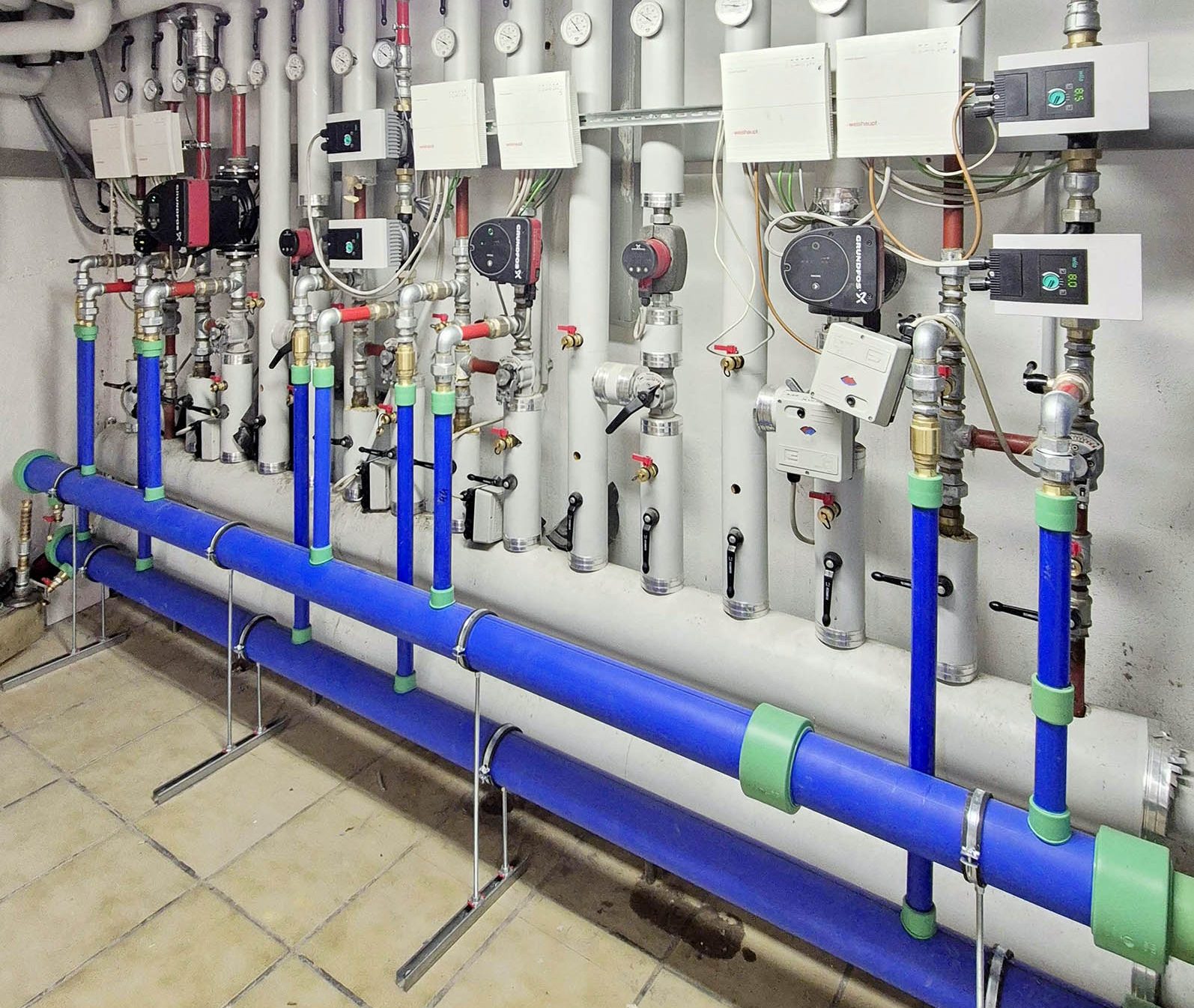 - rete di distribuzione a 2 tubi con 8 linee montanti, ciascuna dotata di elettropompa dedicata;