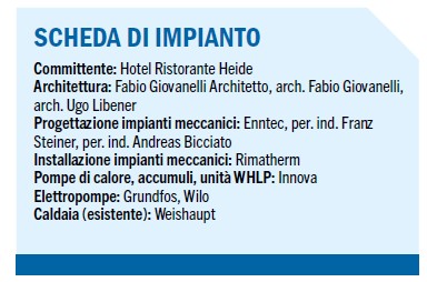 - durante la stagione fredda WLHP riscalda le camere e tutti gli spazi aperti al pubblico (sale per colazioni, buffet e ristorante, connettivo interno), mentre la caldaia riscalda il bar e gli spazi non aperti al pubblico;